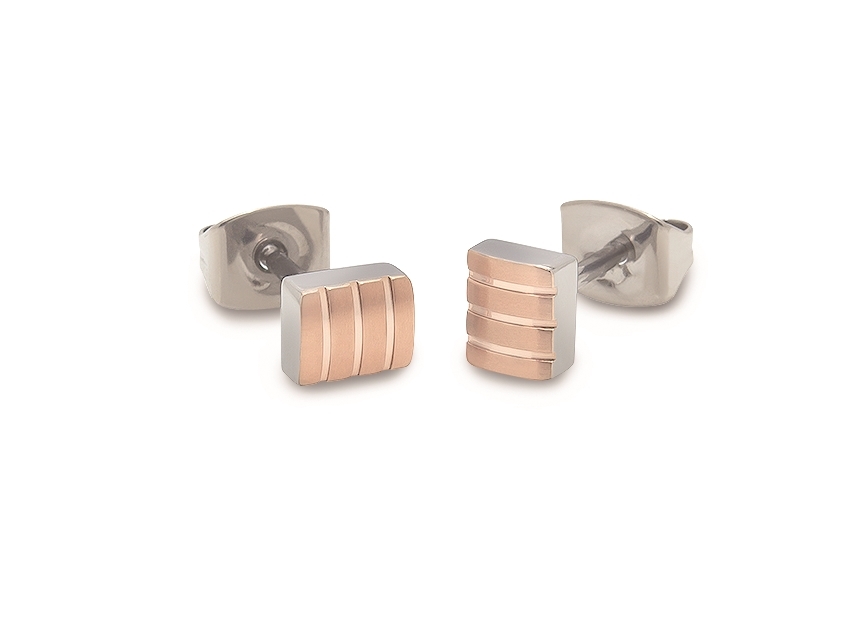 Titanové náušnice s uzávěrem na puzetu. Náušnice mají kombinovanou matnou a zlacenou povrchovou úpravu v barvě růžového zlata