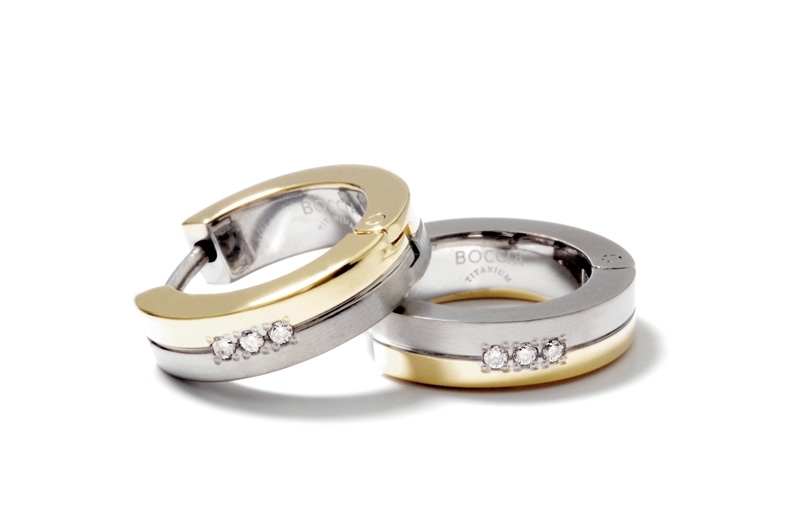 Titanové náušnice kroužky zdobené 6ti diamanty. Náušnice mají kombinovanou matnou a zlacenou povrchovou úpravu v barvě žlutého zlata