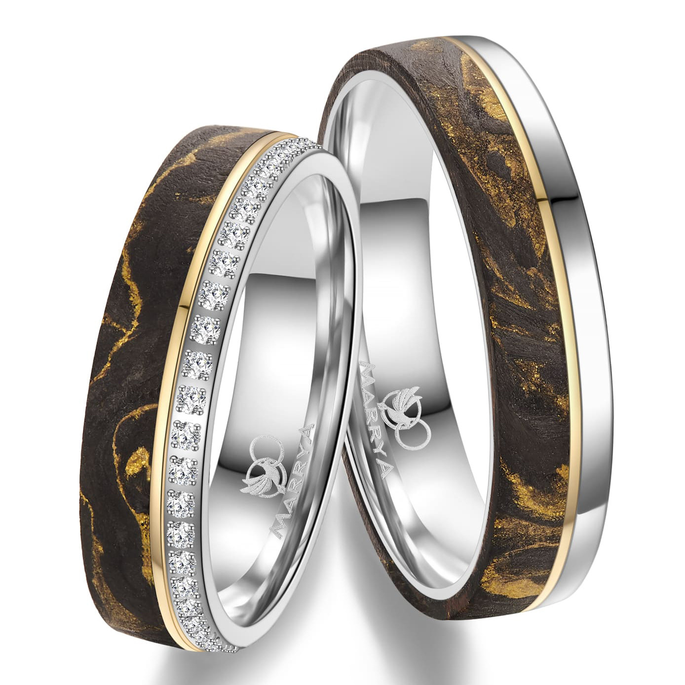 Prsteny jsou vyrobeny z kombinace materiálu nerezová ocel a černý karbon se zlatavými odlesky. Prsteny jsou dekorovány decentní zlacenou drážkou. Prsteny mají jemně zaoblený profil a je pro pohodlné nošení jsou uvnitř bombírované