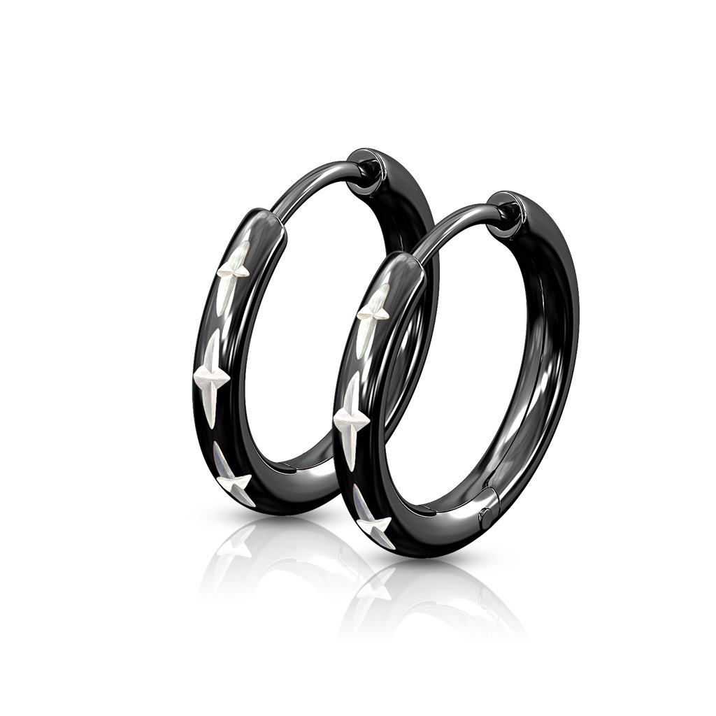 Černé ocelové náušnice kroužky zdobené křížkovým dekorem
