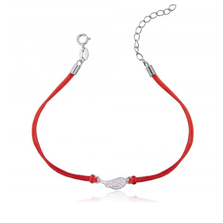 Červený textilní náramek dekorovaný přívěškem ve tvaru andělského křídla, které je vyrobeno z rhodiovaného stříbra 925/1000 a je zdobeno kubickými zirkony čiré barvy.