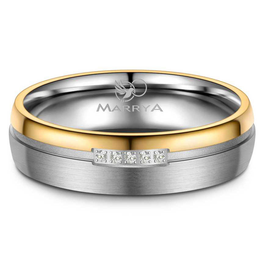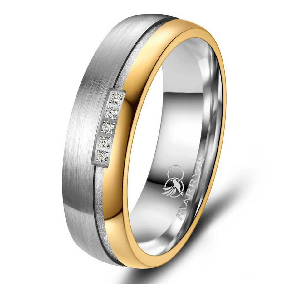 Dámský prsten má kombinovanou matnou povrchovou a povrch v barvě žlutého zlata. Střed prstenu je osazený pěti zirkony čiré barvy. Prsten má lehce zaoblený profil a pro pohodlné nošení je prsten uvnitř bombírovaný.