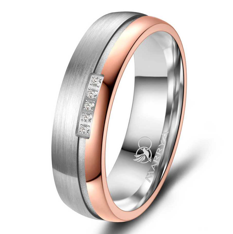 Dámský prsten má kombinovanou matnou povrchovou a povrch v barvě růžového zlata. Střed prstenu je osazený pěti zirkony čiré barvy. Prsten má lehce zaoblený profil a pro pohodlné nošení je prsten uvnitř bombírovaný.