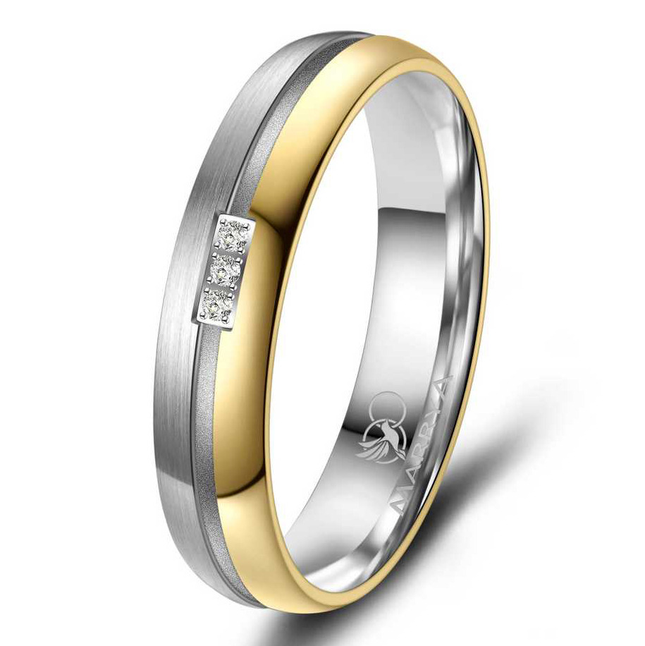 Dámský prsten má kombinovanou matnou povrchovou a povrch v barvě žlutého zlata. Střed prstenu je osazený třemi zirkony čiré barvy. Prsten má lehce zaoblený profil a pro pohodlné nošení je prsten uvnitř bombírovaný.