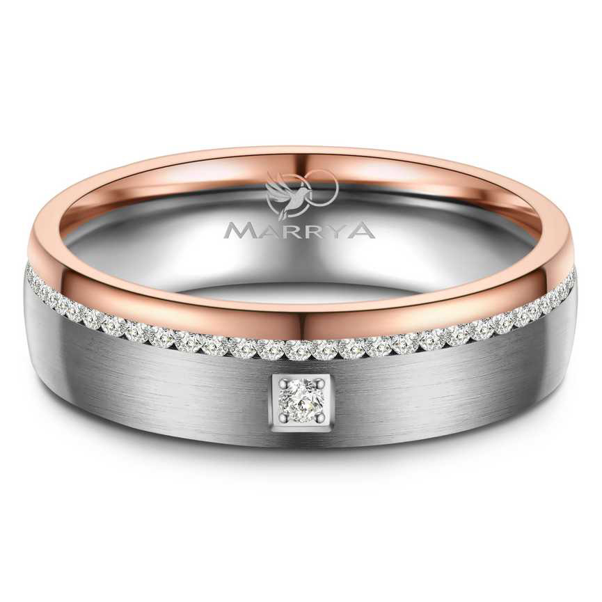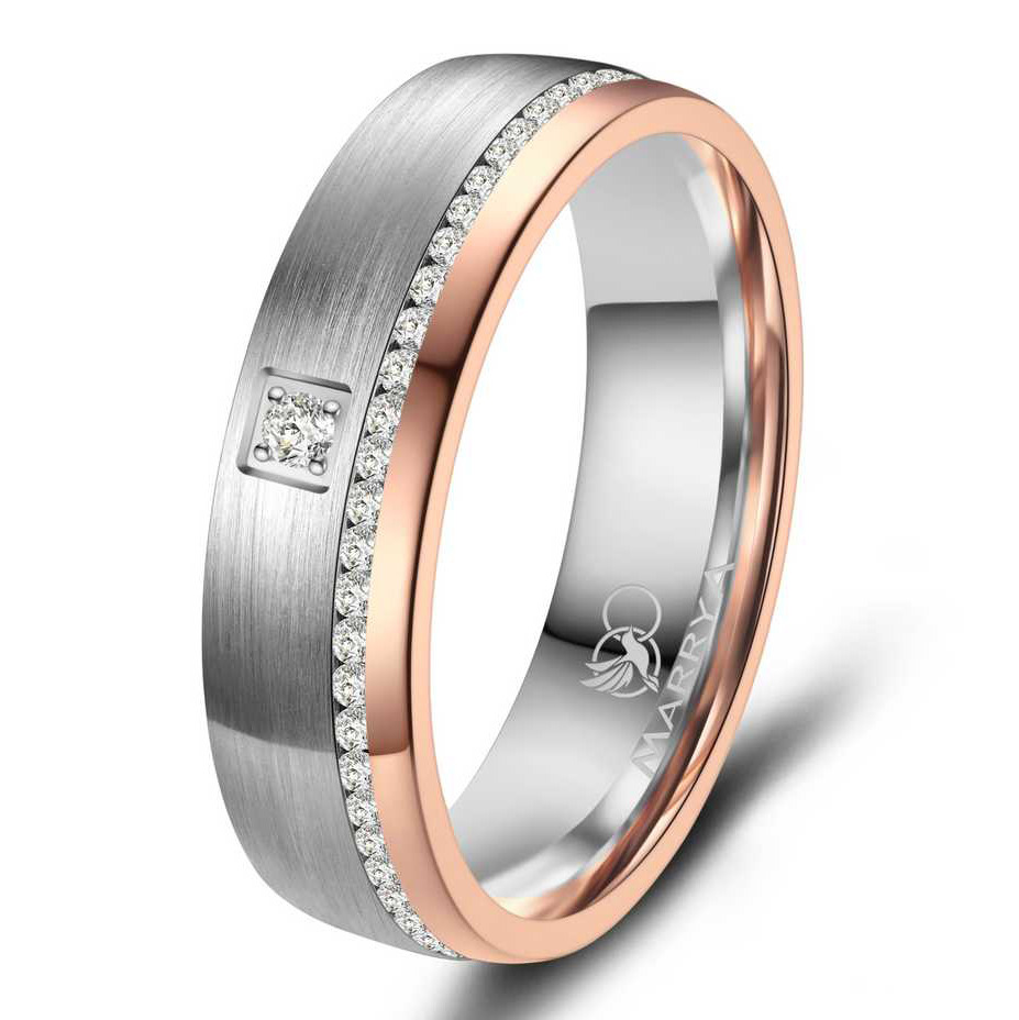 Dámský prsten má kombinovanou matnou povrchovou úpravou a povrchovou úpravu v barvě růžového zlata a po celém obvodu ho zdobí zirkony usazené v decentní drážce. Prsten má jemně zaoblený profil a je pro pohodlné nošení je uvnitř bombírovaný.