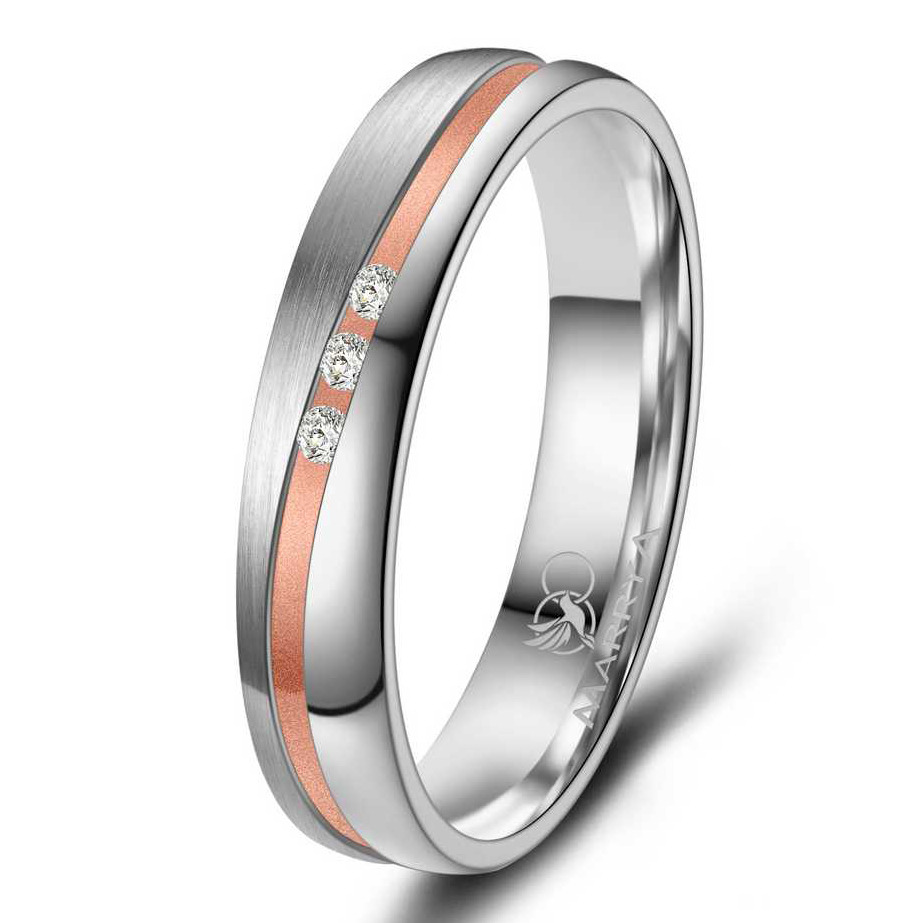 Dámský prsten má kombinovaný matný a lesklý povrch a je dekorován decentní šikmou drážkou v barvě růžového zlata, do které jsou vsazeny tři diamanty. Prsten je pro pohodlné nošení uvnitř bombírovaný.