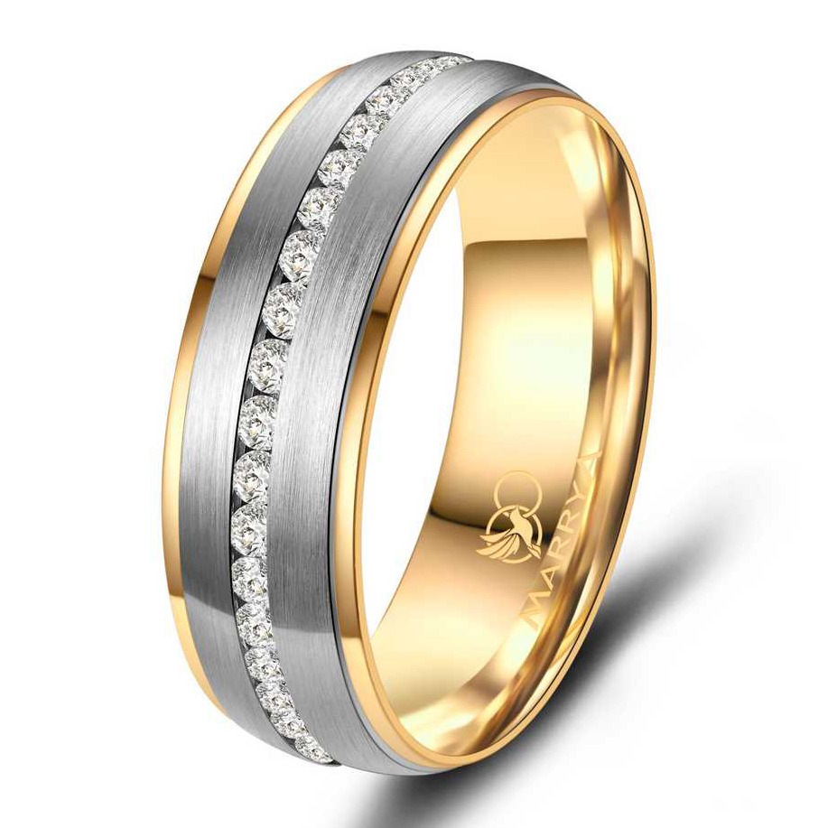 Dámský prsten má matnou povrchovou úpravou a je doplněn povrchovou úpravu v barvě žlutého zlata, střed prstenu je po celém obvodu osazený pruhem zirkonů čiré barvy. Prsten má rovný profil, pro pohodlné nošení je prsten uvnitř bombírovaný.