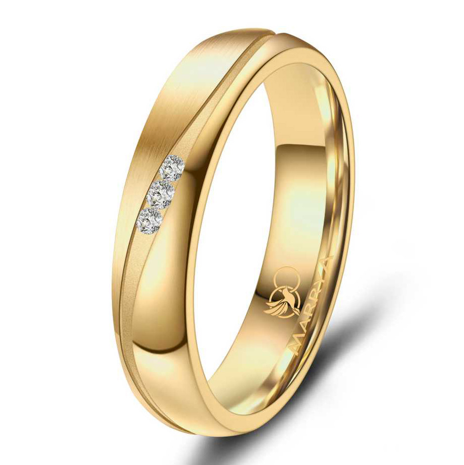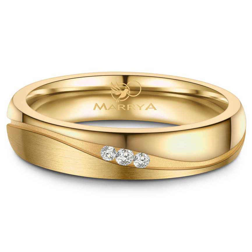 Dámský prsten má kombinovanou matnou a lesklou povrchovou úpravou v barvě žlutého zlata a je dekorován decentní šikmou drážkou, ve které jsou usazeny zirkony čiré barvy. Prsten má jemně zaoblený profil a je pro pohodlné nošení je uvnitř bombírovaný.