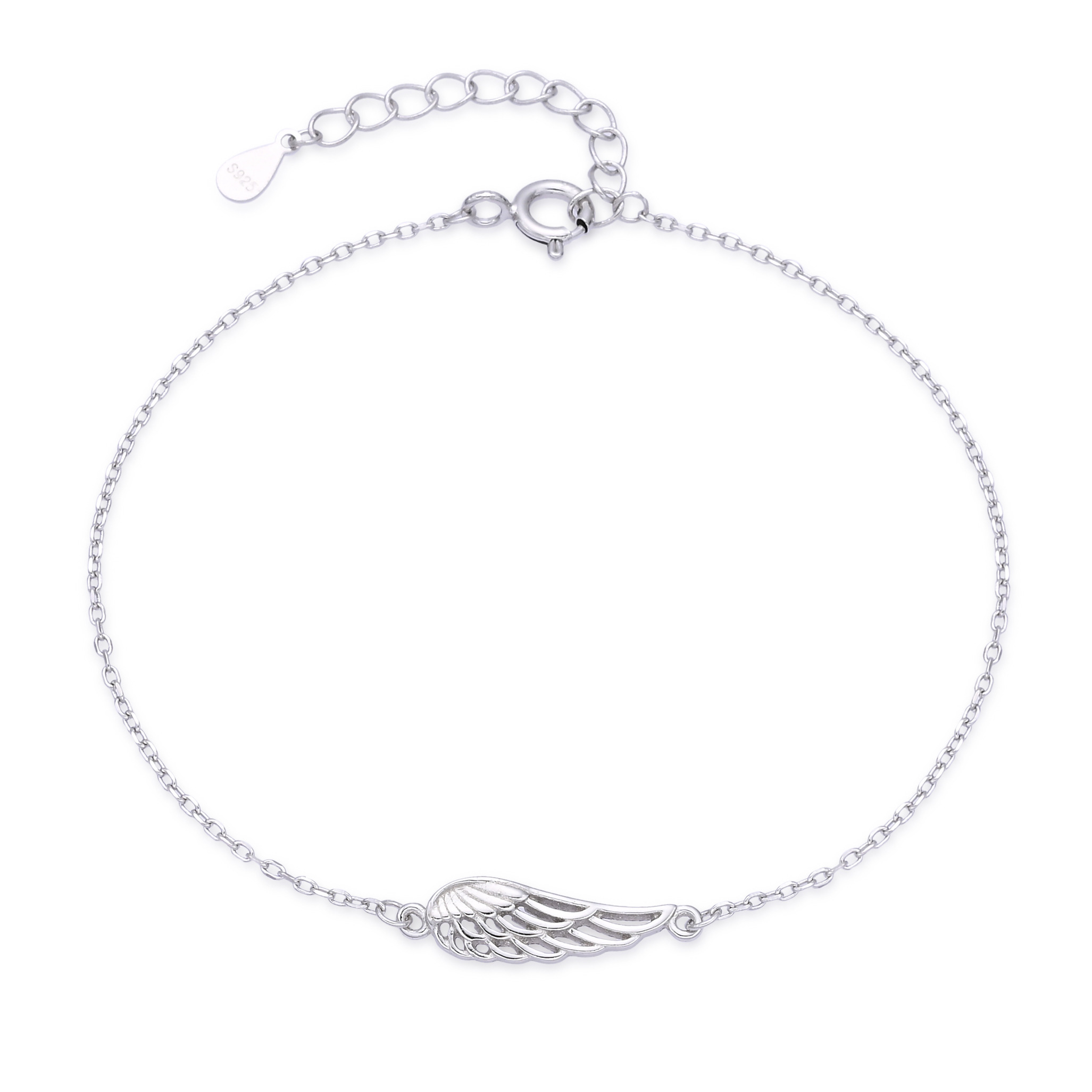 Dámský stříbrný náramek dekorovaný přívěskem ve tvaru andělského křídla zdobeného zirkony čiré barvy