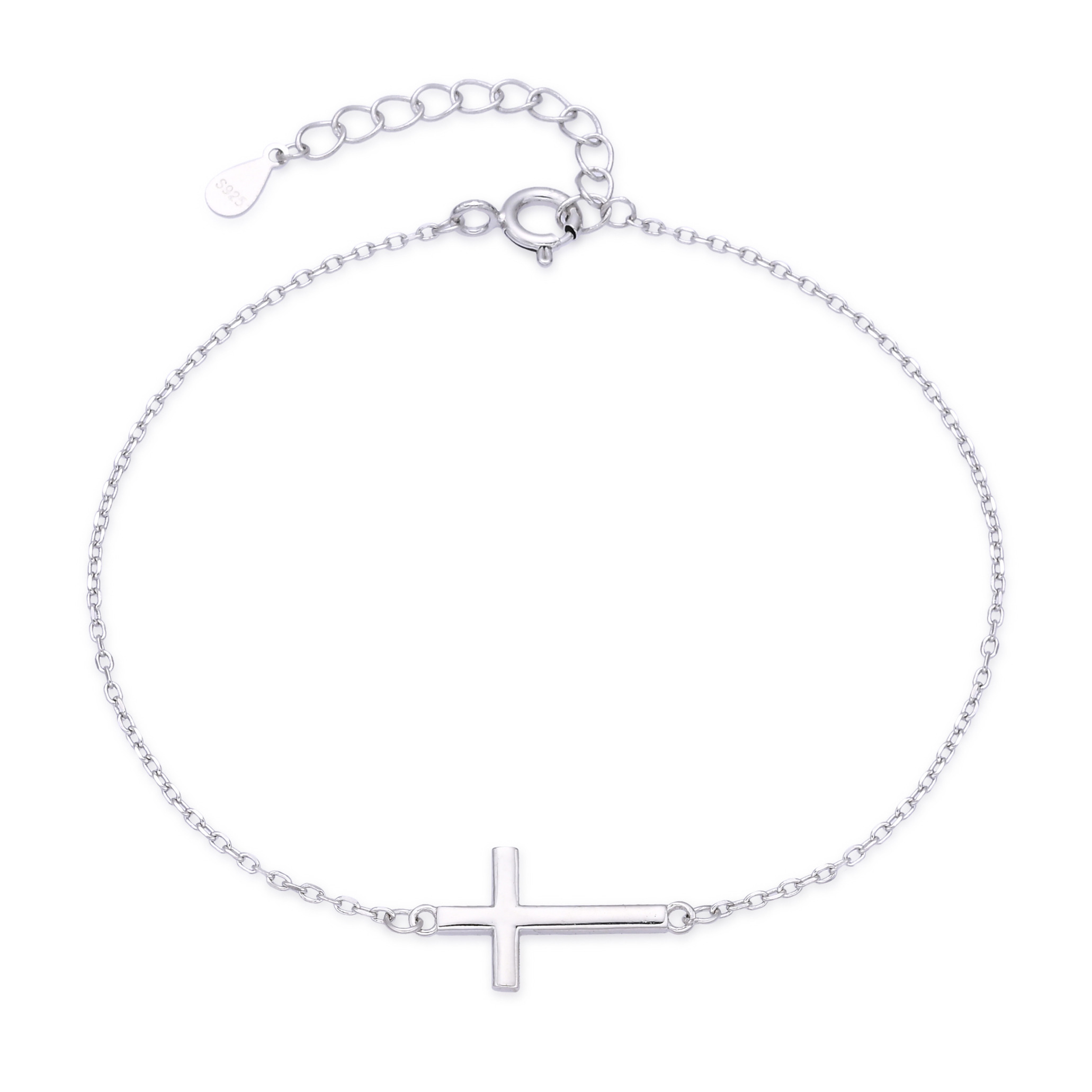 Dámský stříbrný náramek dekorovaný přívěškem ve tvaru drobého křížku zdobeného zirkony