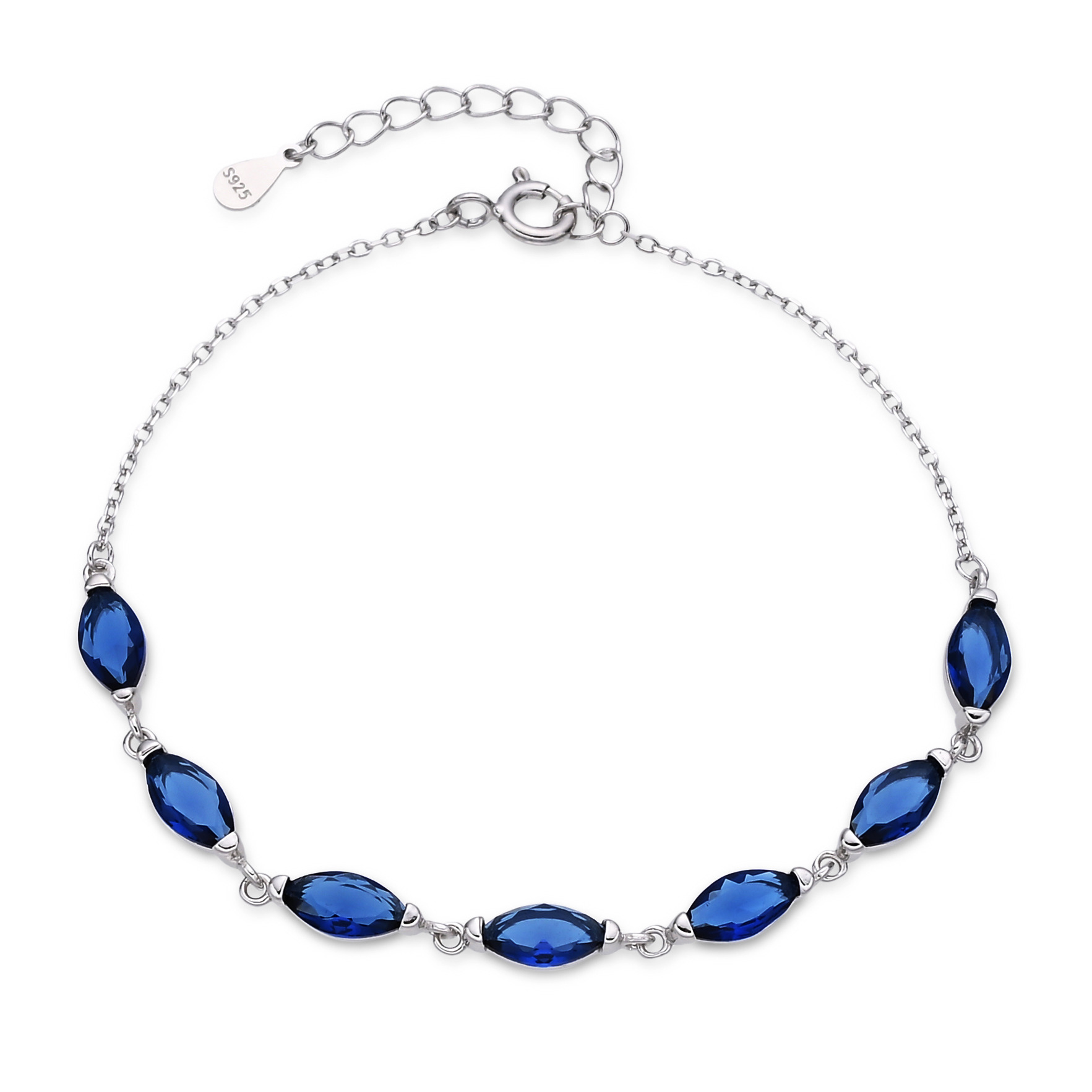 Dámský stříbrný náramek dekorovaný podlouhlými modrými zirkony