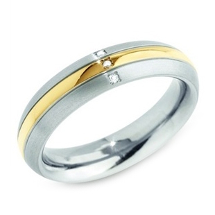 Matný titanový snubní prsten s ozdobným zlaceným leštěným pruhem probíhajícím středem prstenu. Prsten je osazen 3mi diamanty čiré barvy