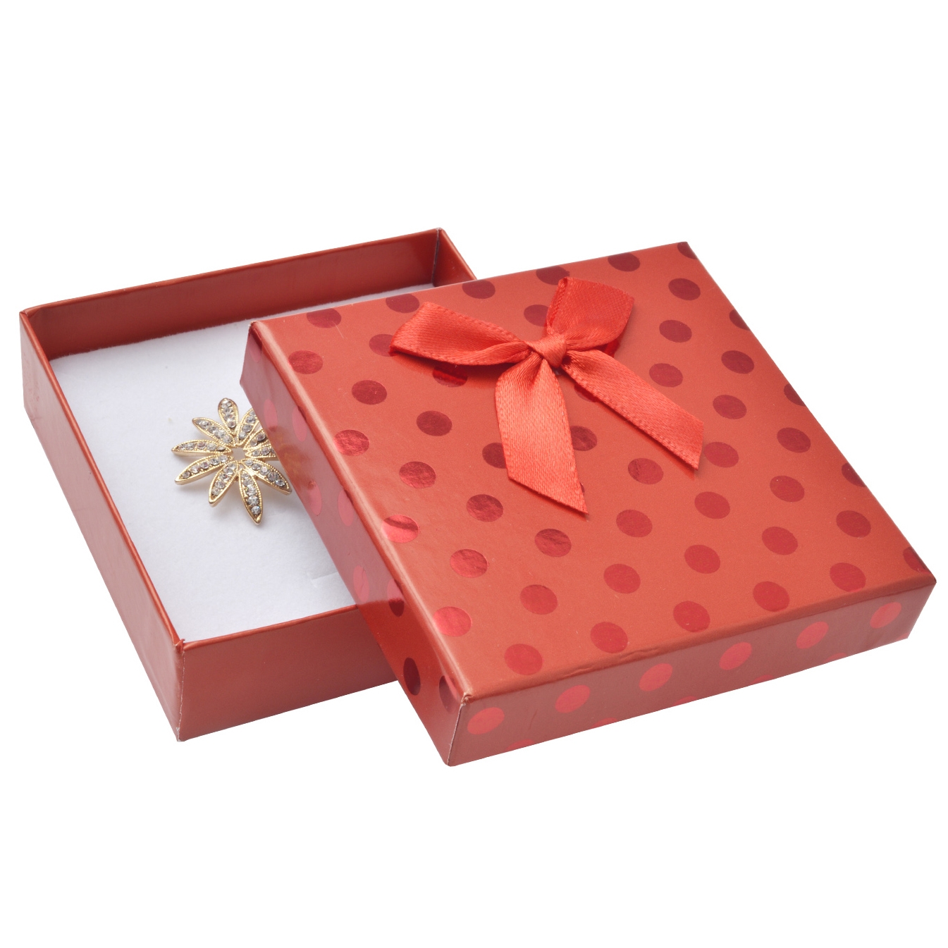 Krabička je zdobená červenými lesklými puntíky a červenou mašlí