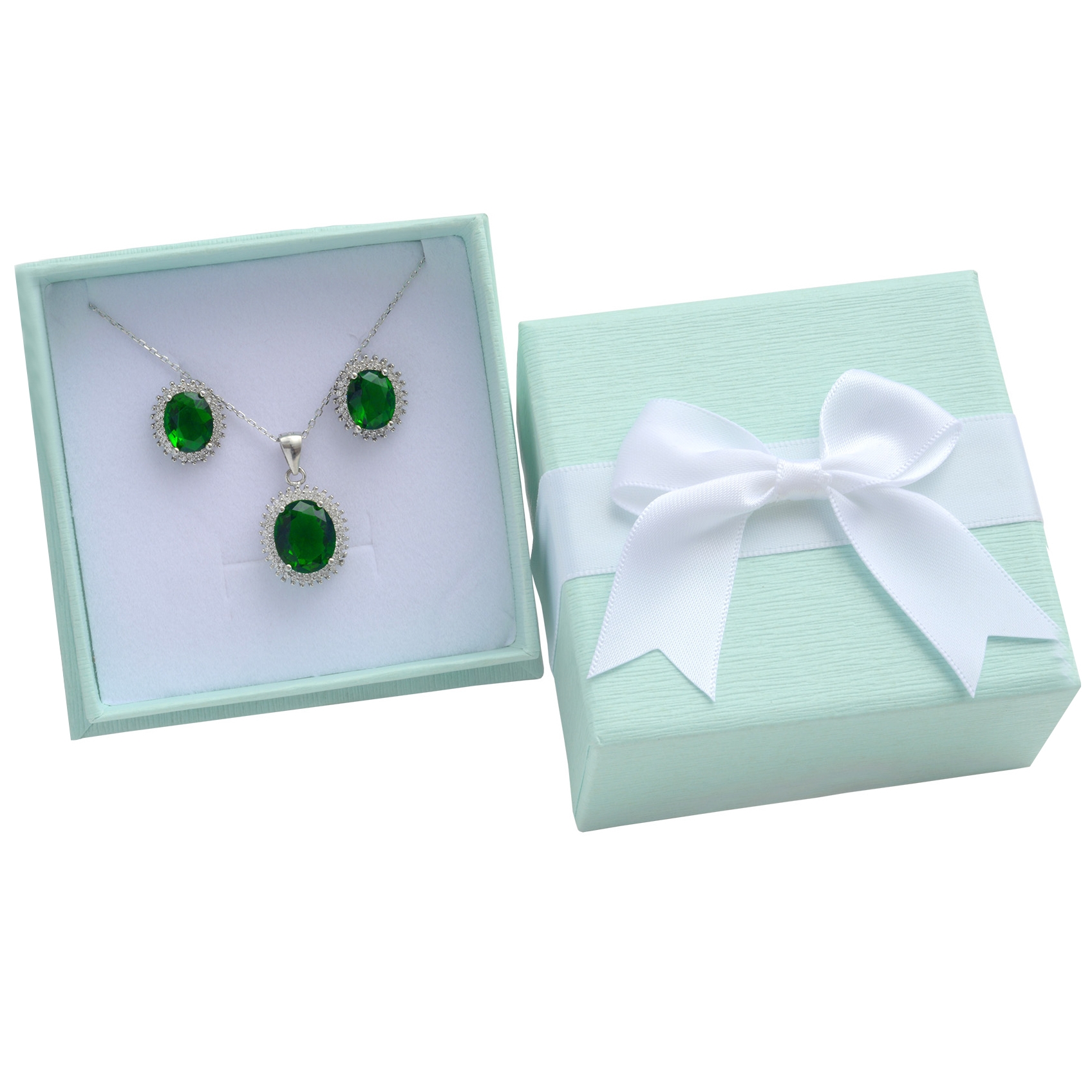Světle modrá papírová dárková krabička na soupravu šperků zdobená stuhou bílé barvy