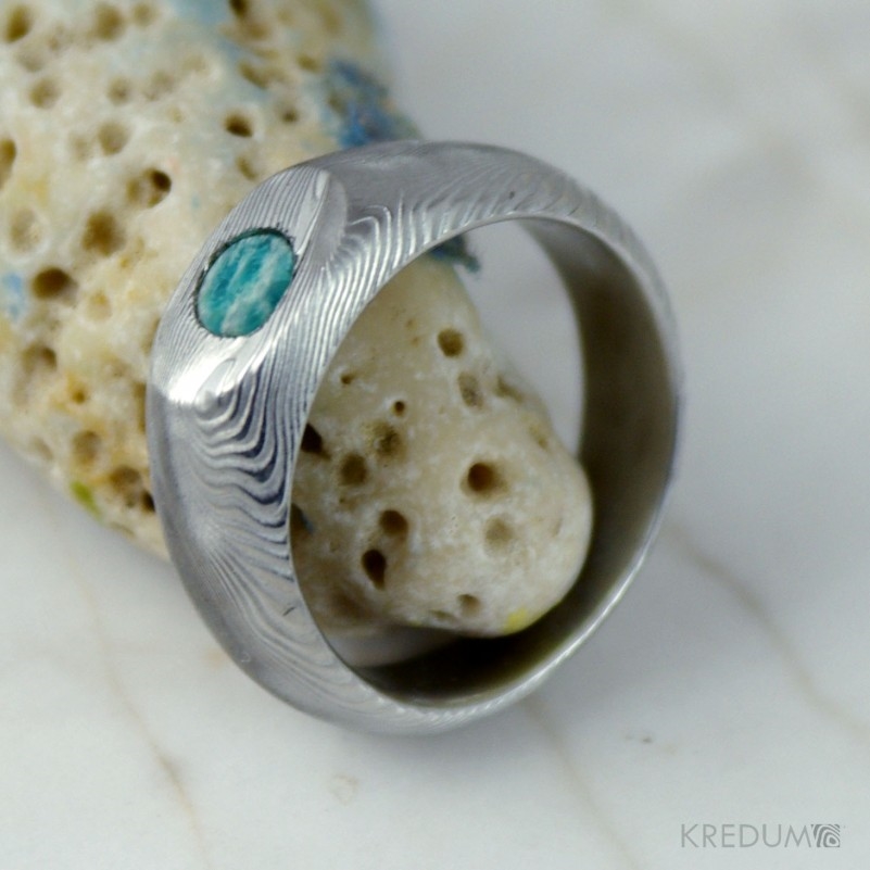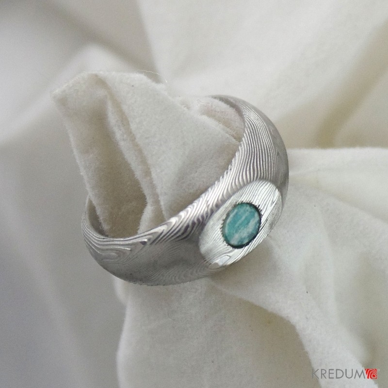 Kovaný prsten damasteel Natalia s přírodním Amazonitem. Prsten se vyznačuje jednoduchou linií bez zbytečných ozdob.