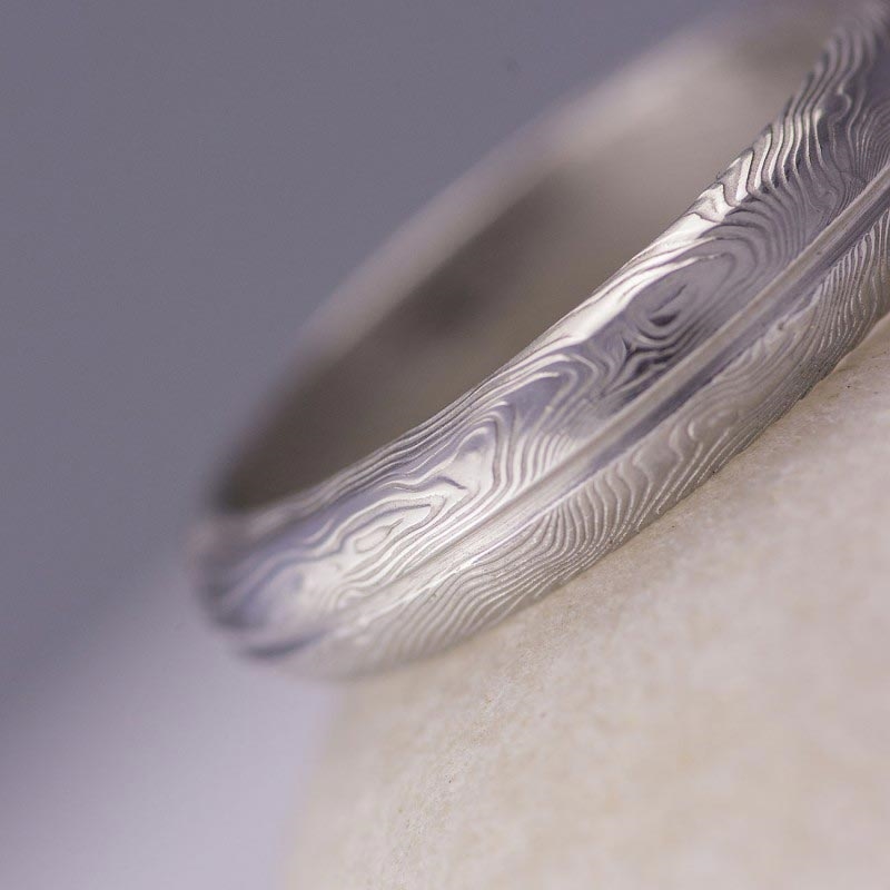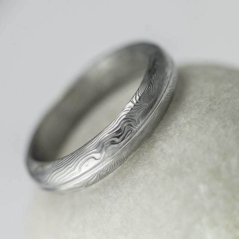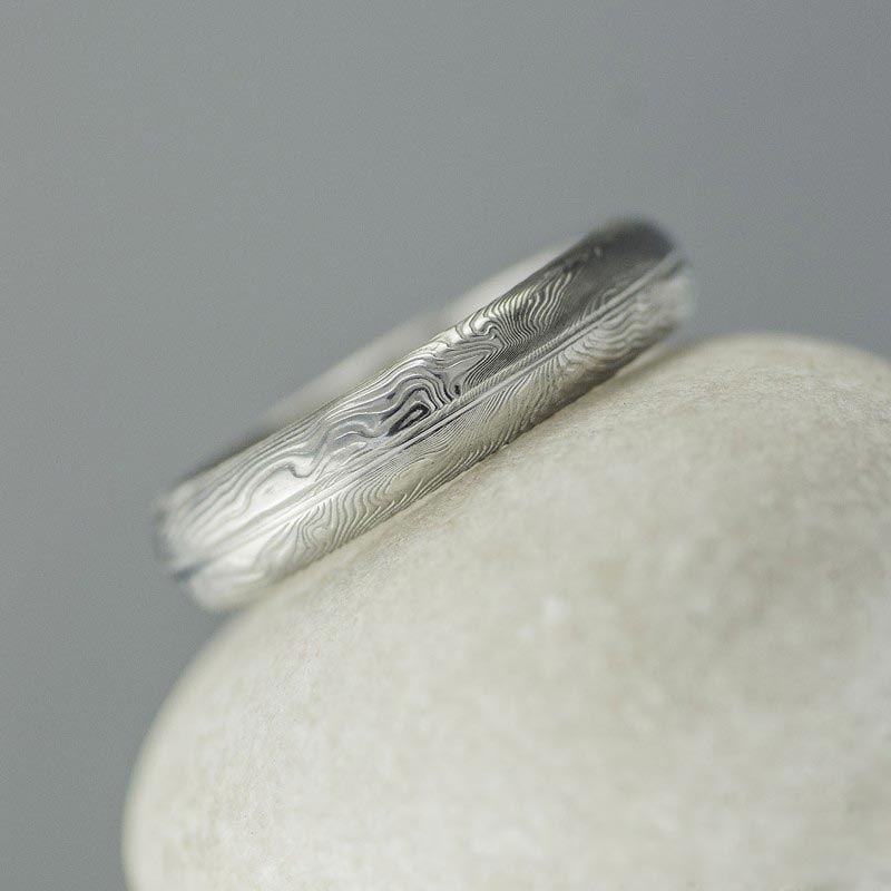 Ručně kované nerezové snubní prsteny z oceli damasteel, které se vyznačují jednoduchou linií bez zbytečných ozdob.