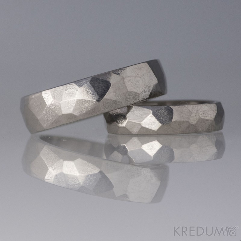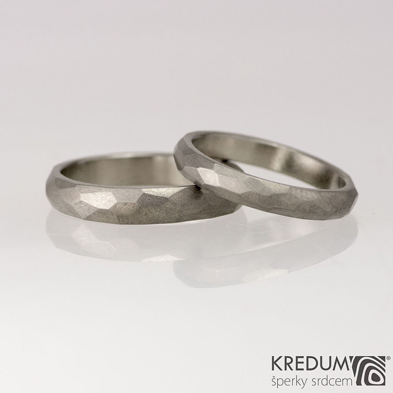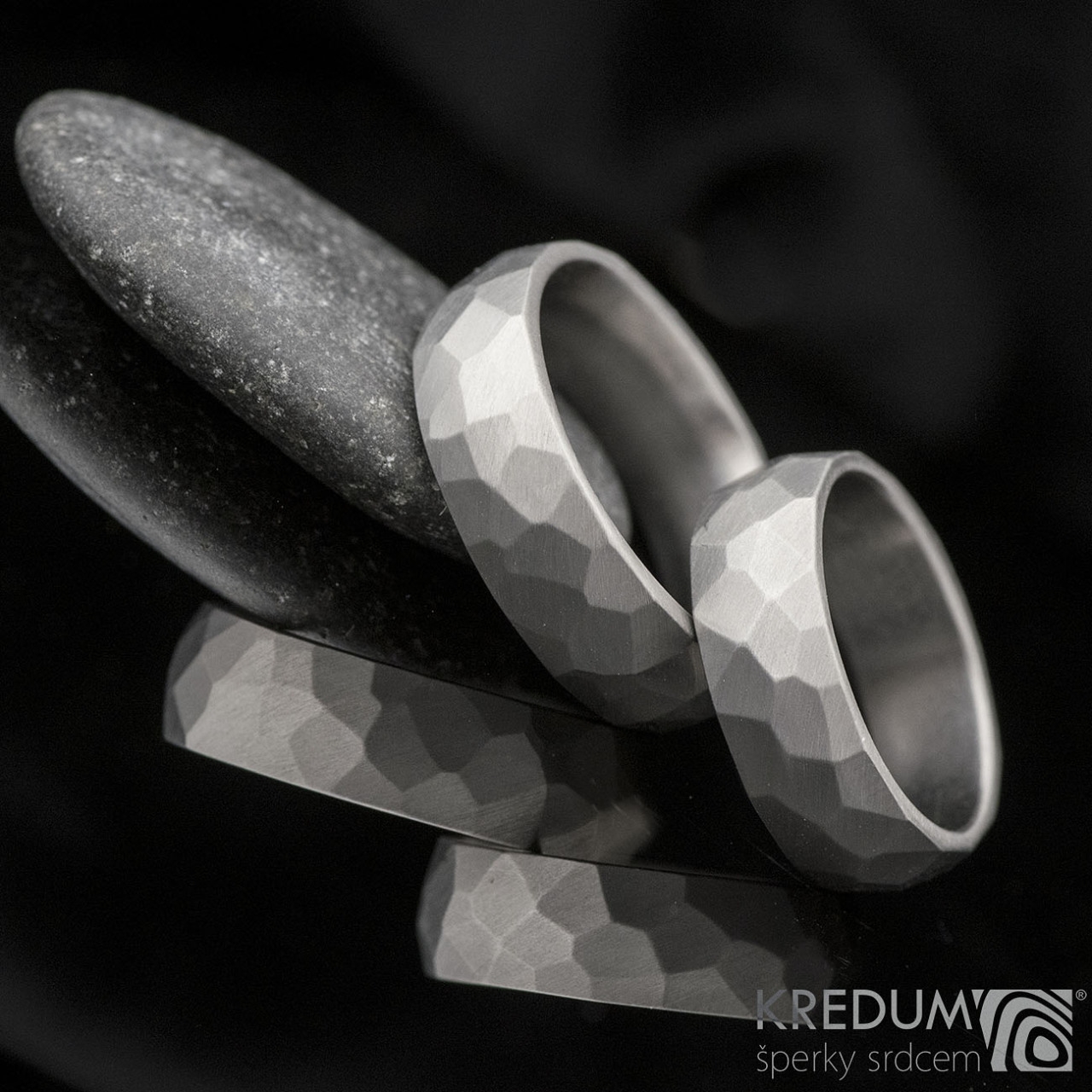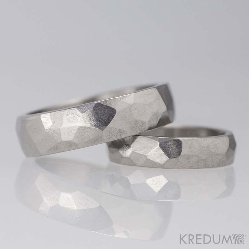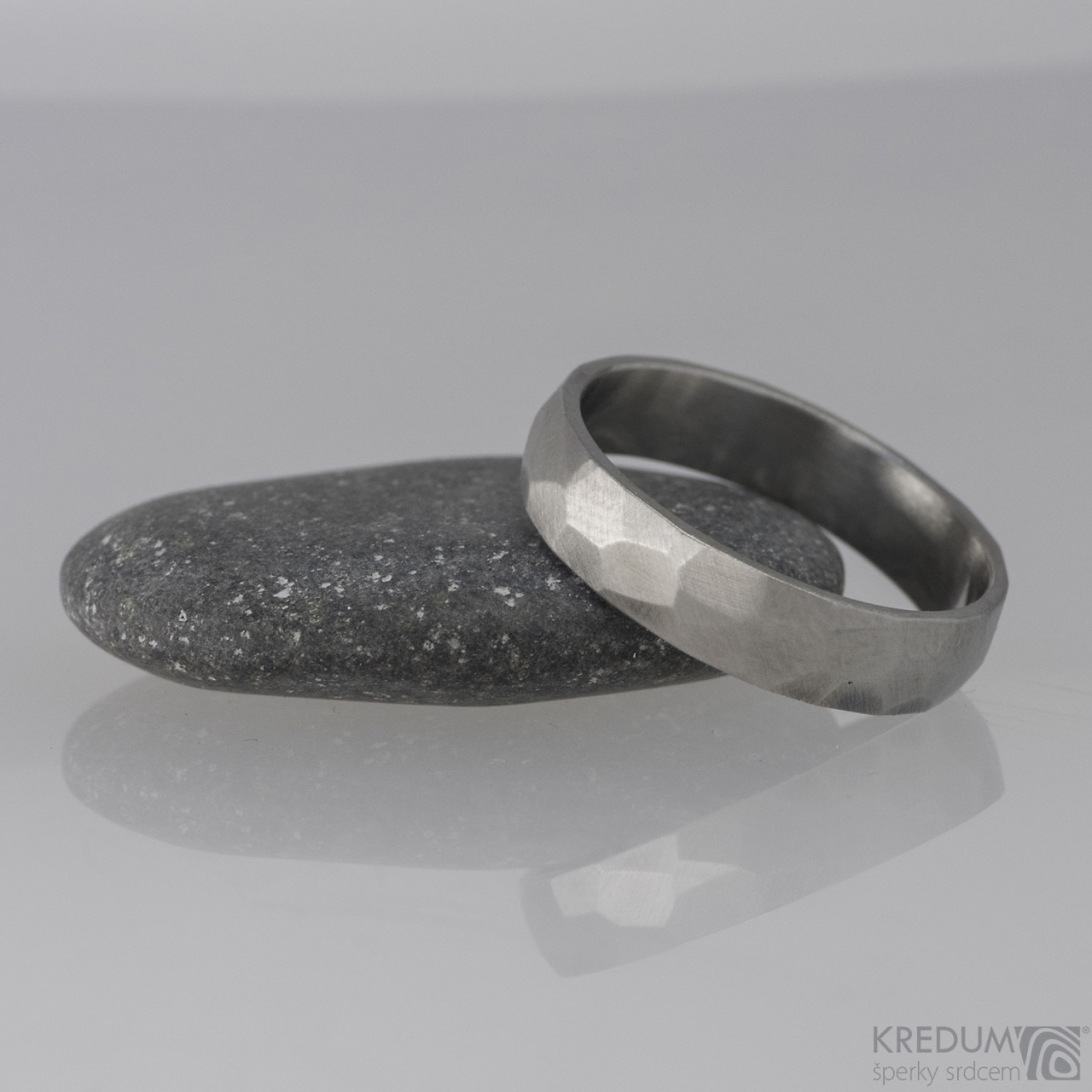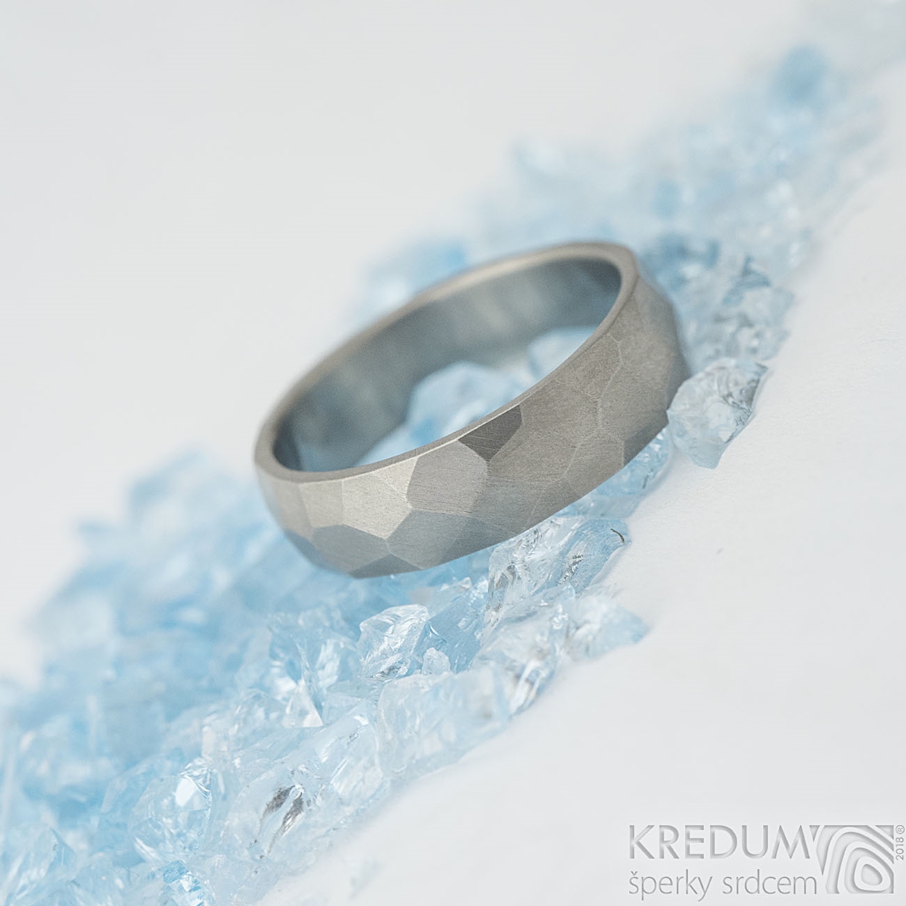 Dámský snubní prsten vyhotovený z ručně kovaného titanu, povrch prstenu je tvořen nahodilými broušenými ploškami