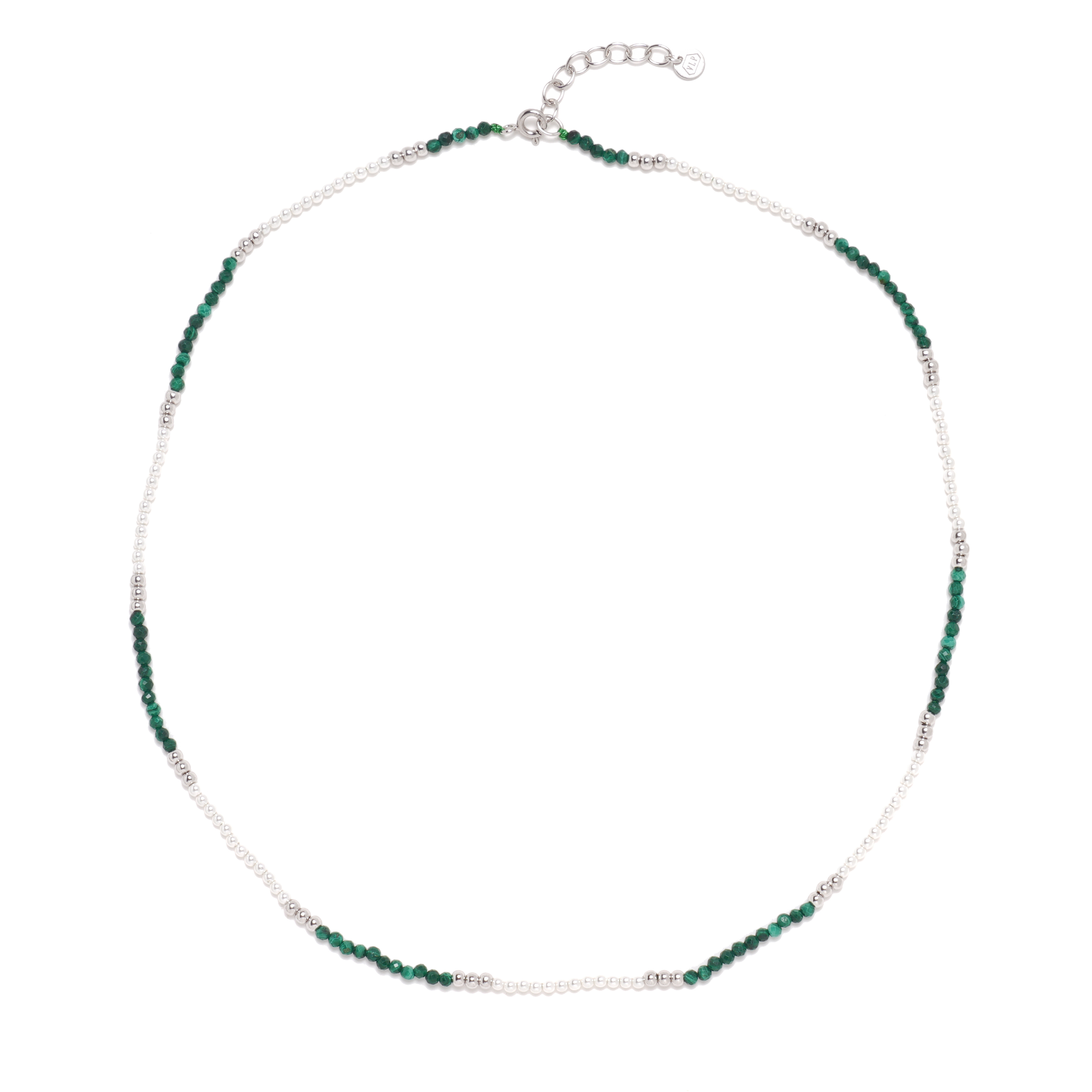 Šperk je vyroben z broušených přírodních korálků malachitu, které jsou doplněny pravými perličkami a kuličkami ze stříbra jakosti 925 povrchově upraveného rhodiovaním.