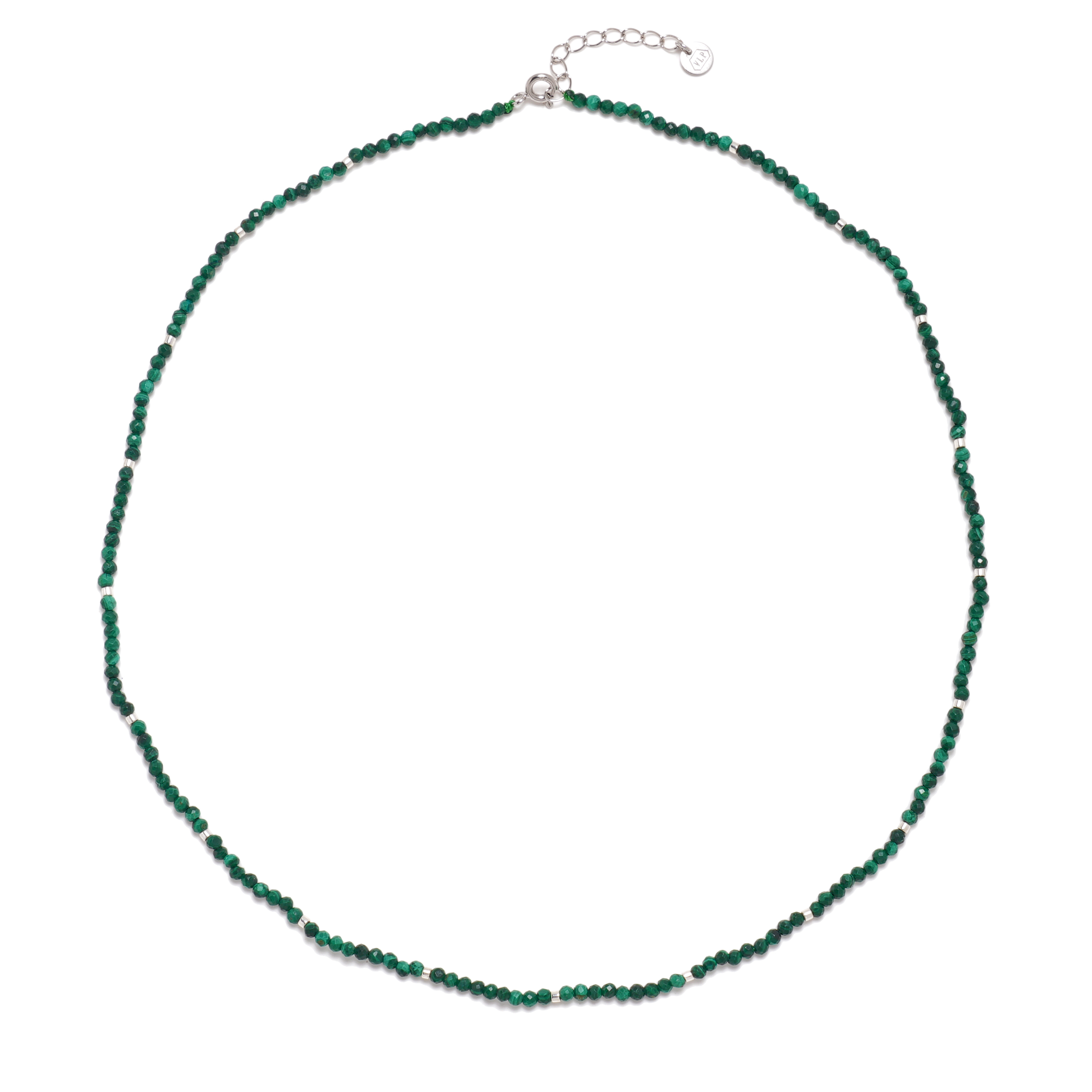 Šperk je vyroben z broušených přírodních korálků malachitu, které jsou doplněny kuličkami ze stříbra jakosti 925 povrchově upraveného rhodiovaním.