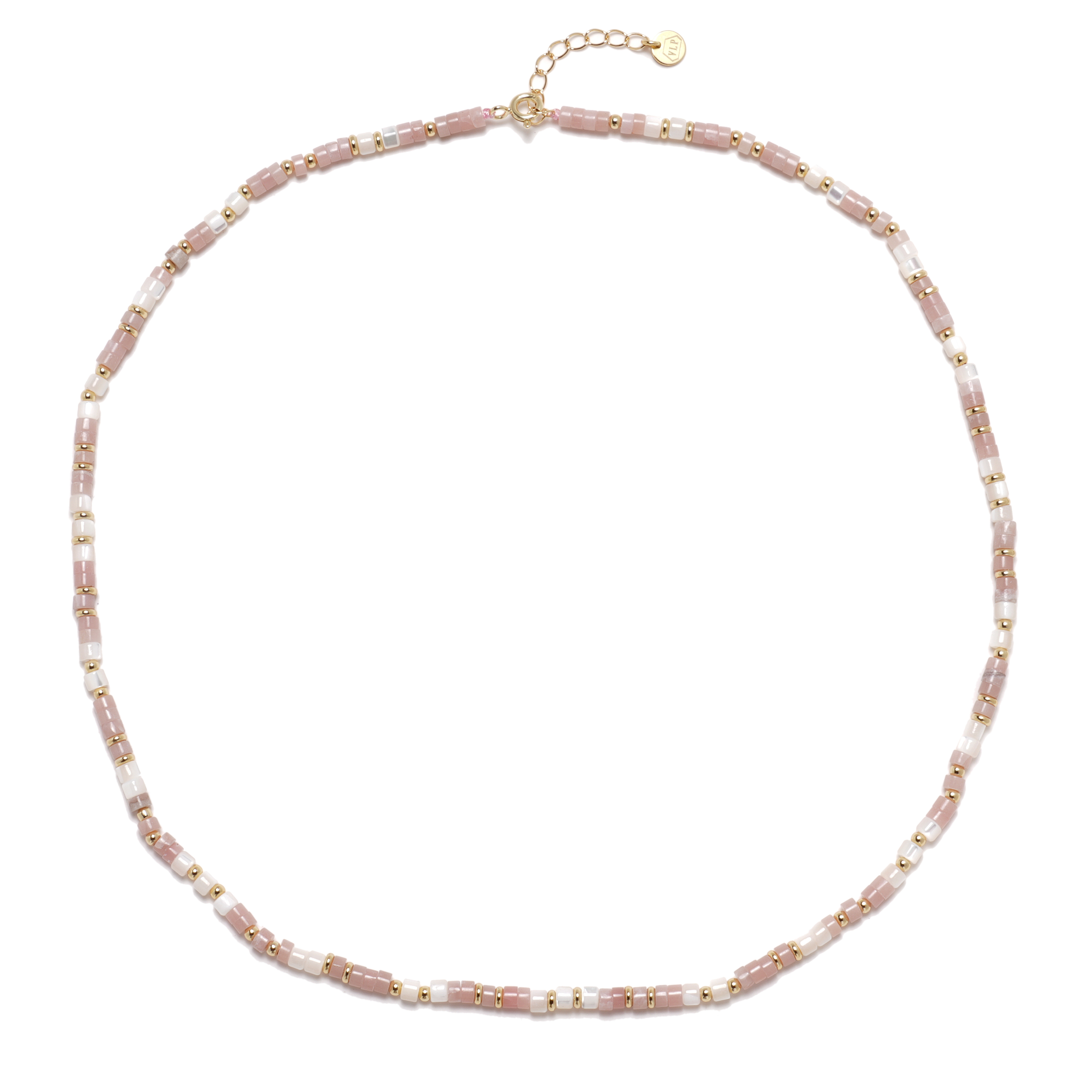 Náhrdelník je vyroben z přírodních korálků Růžového opálu, perleti a komponentami ze stříbra jakosti 925 povrchově zlaceného 14 kt. zlatem.