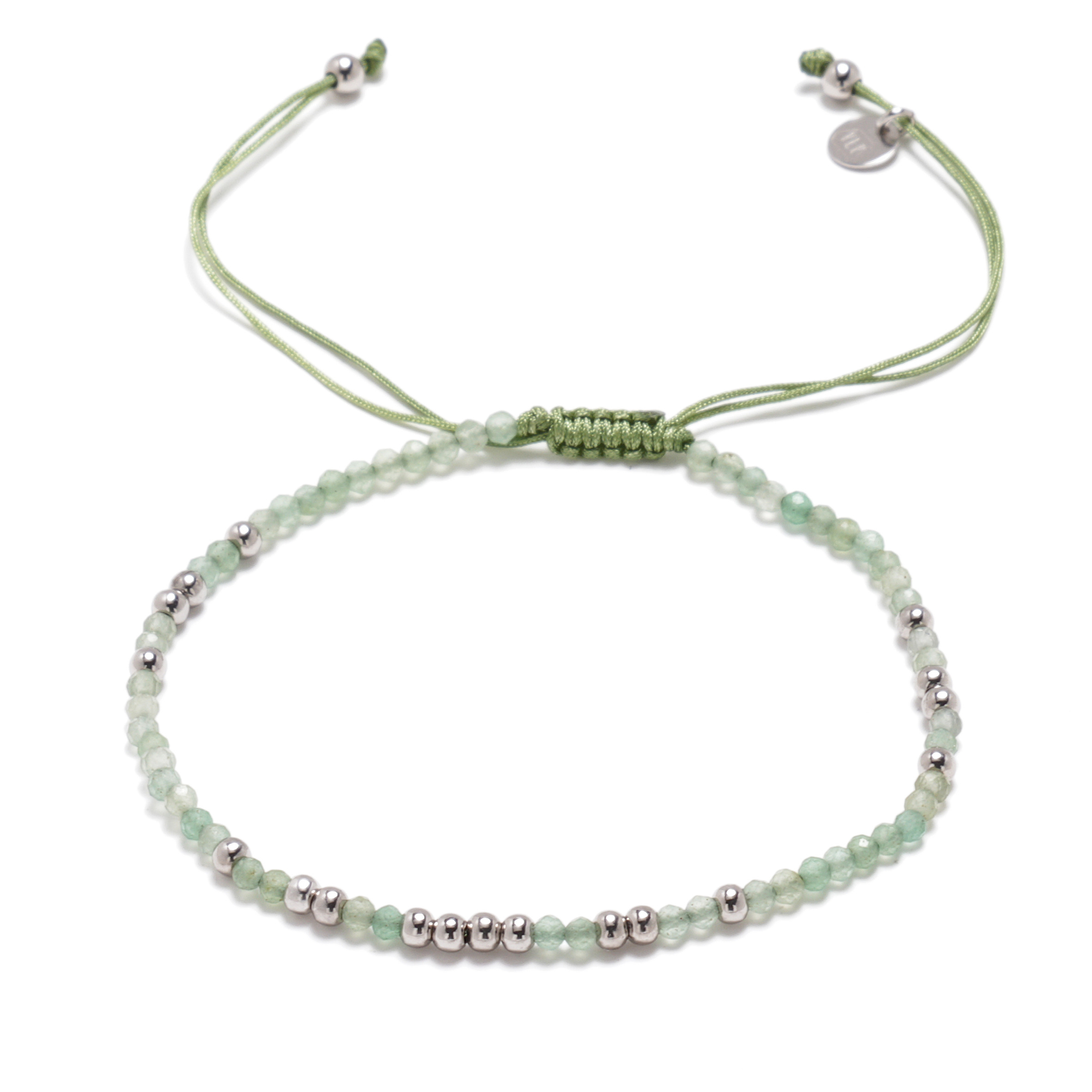 Náramek je vyroben z přírodních korálků Aventurínu, které jsou doplněny kuličkami ze stříbra jakosti 925 povrchově upravenými rhodiovaním.