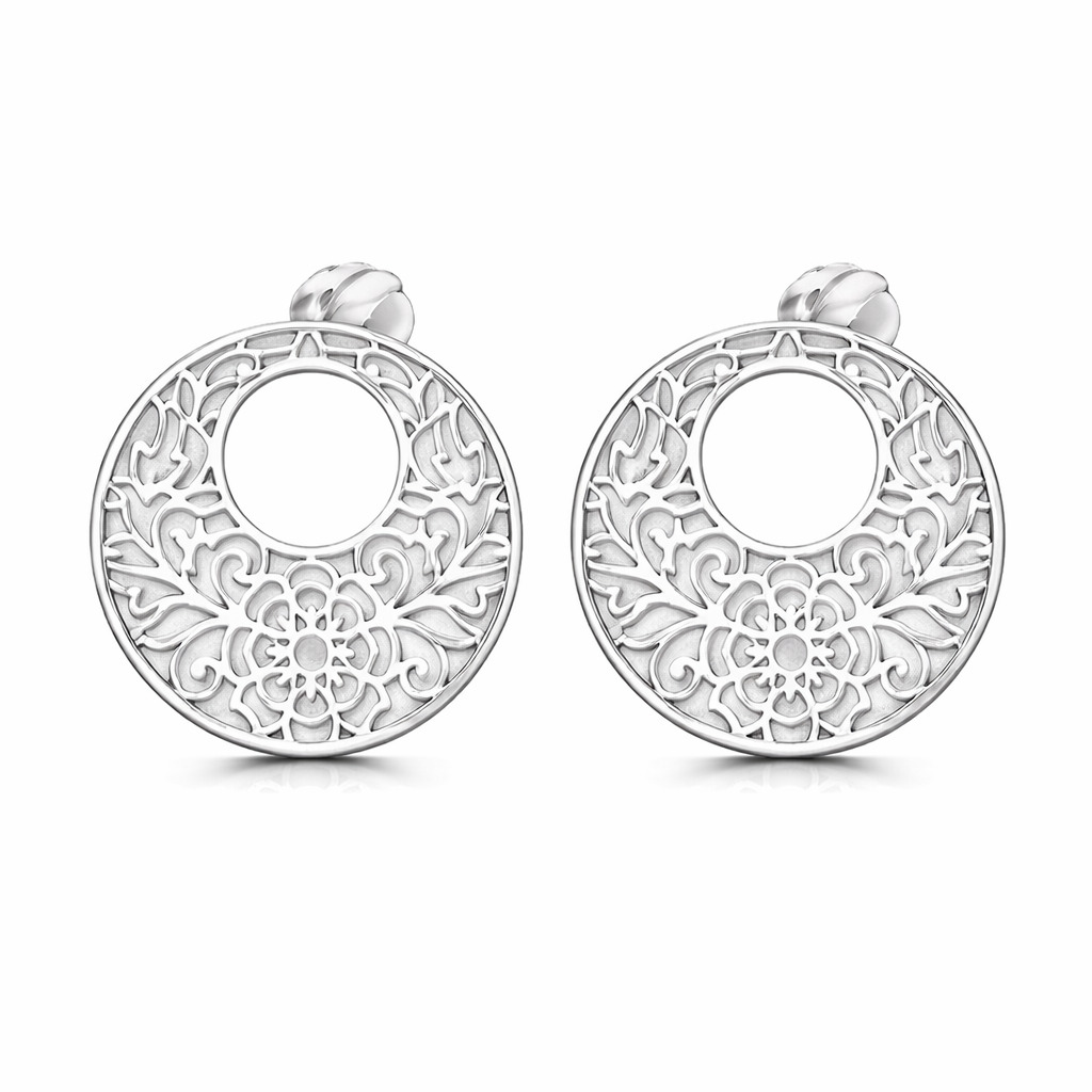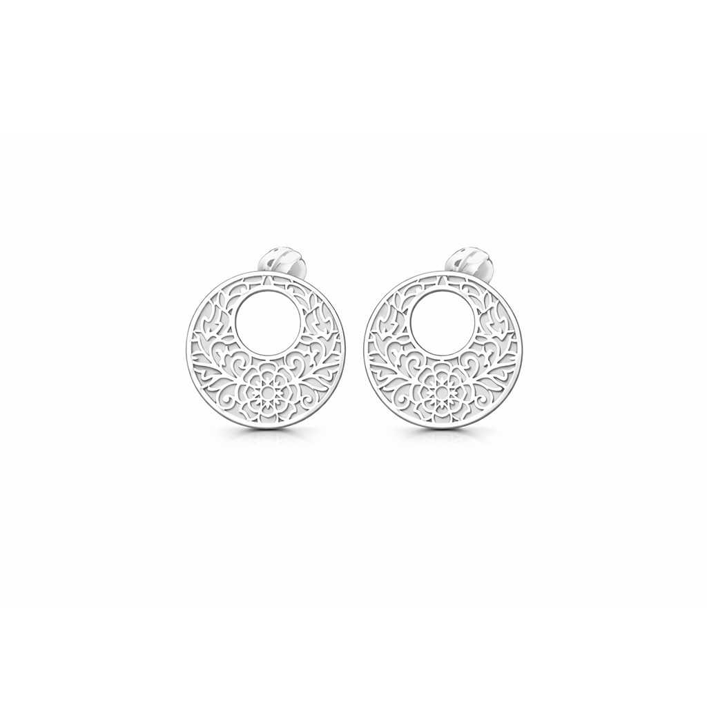 Jemné stříbrné náušnice v kruhovém tvaru s bohatě vyřezávaným mandalovým ornamentem působí vzdušně, lehce a přitom velmi sofistikovaně. Detailní filigránový vzor vytváří krásnou hru světla a dodává šperku nadčasový a luxusní vzhled.