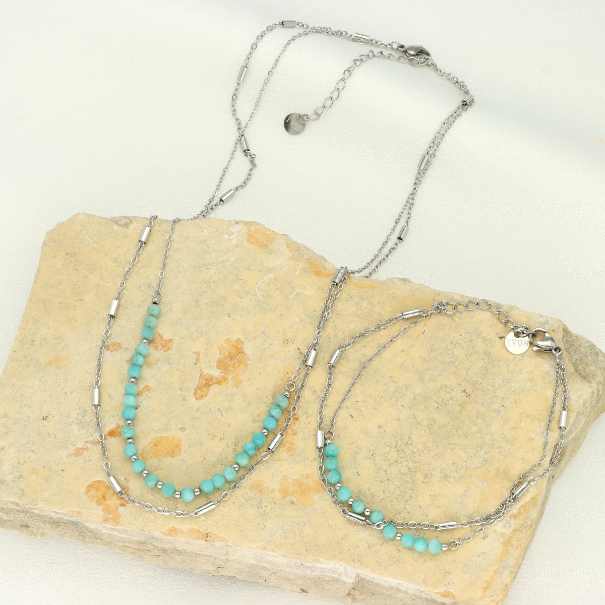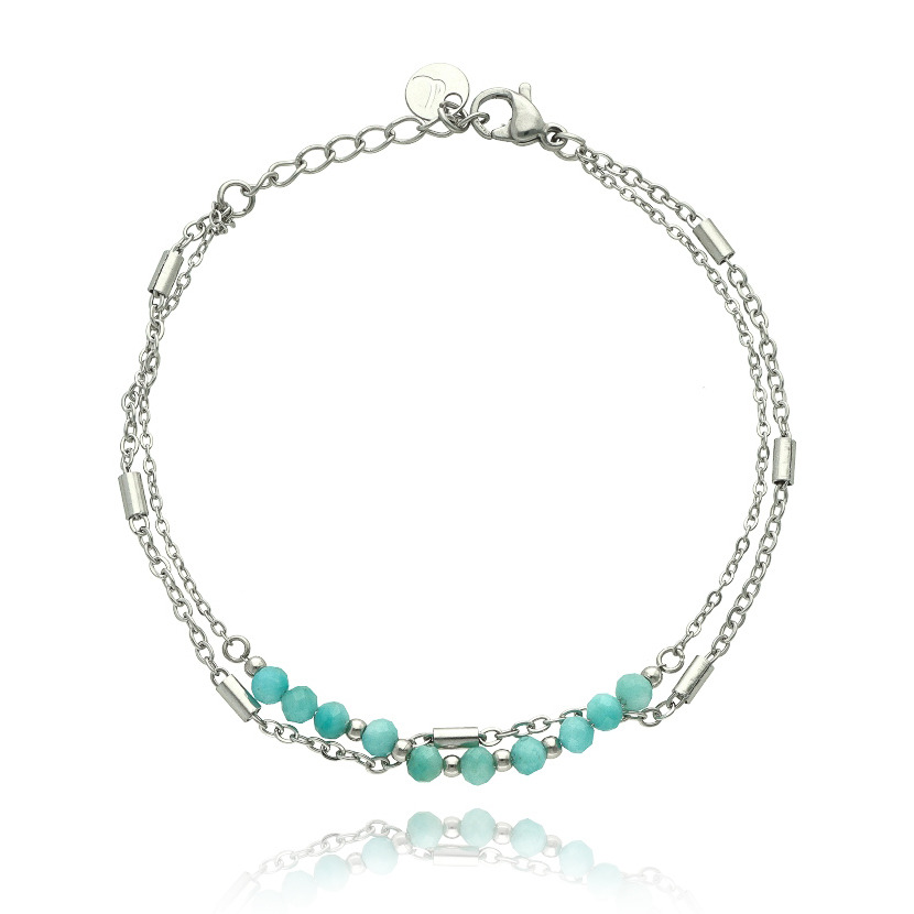 Je vyroben z broušených přírodních korálků amazonitu, které jsou doplněny prvky z nerozové oceli.