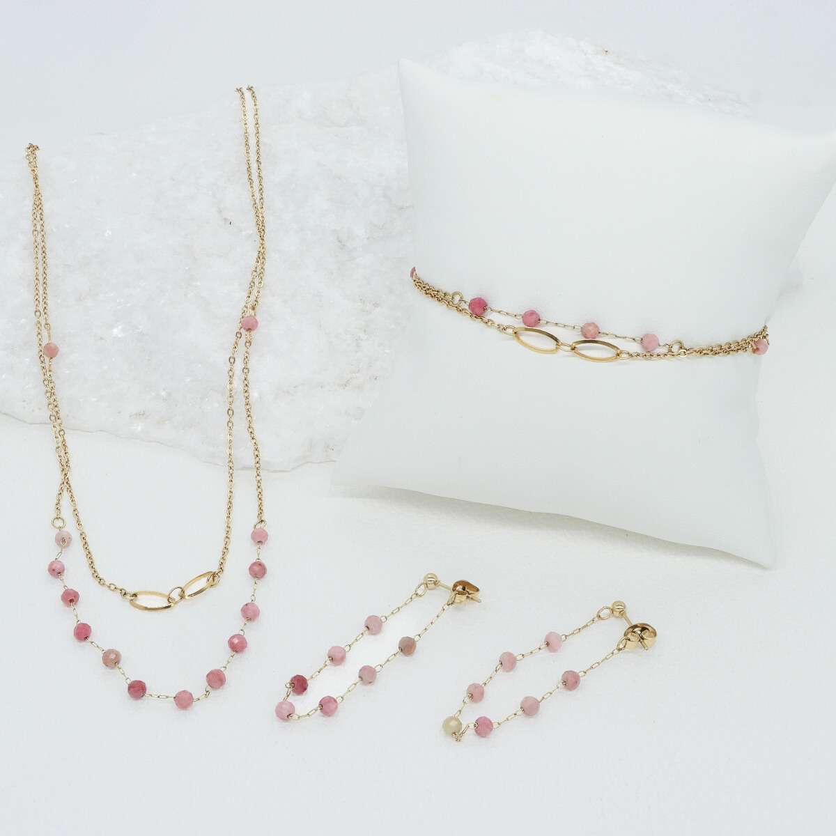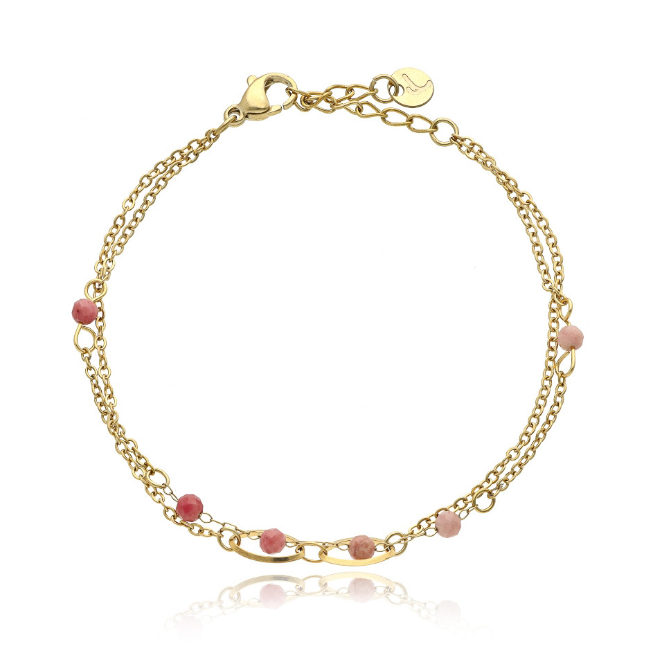 Náramek je vyroben z broušených přírodních korálků Rodonitu a sladkovodními perlami, které jsou doplněny komponentami z nerezové oceli pokovenými 14 kt žlutým zlatem.
