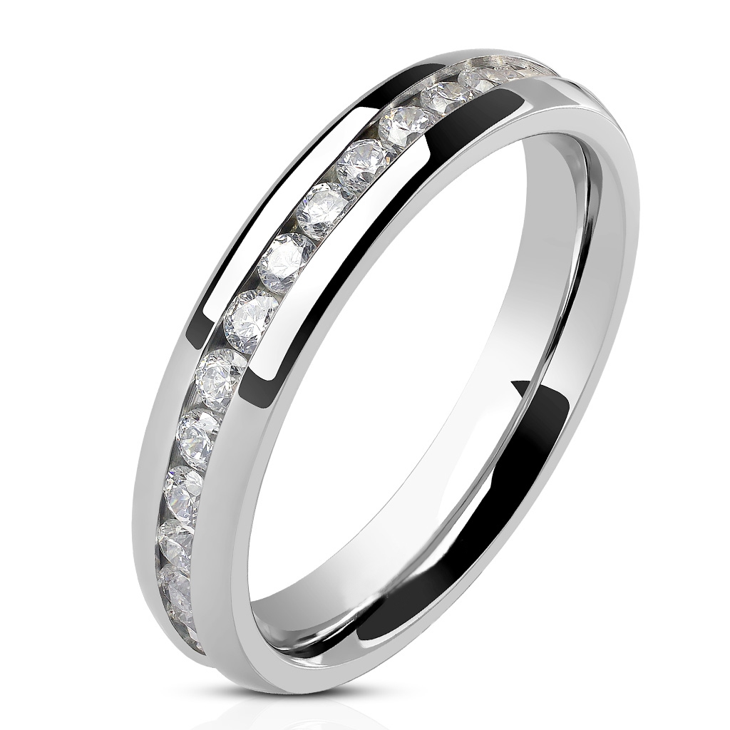 Dámský snubní ocelový prsten po svém obvodu osázený kubickými zirkony čiré barvy.