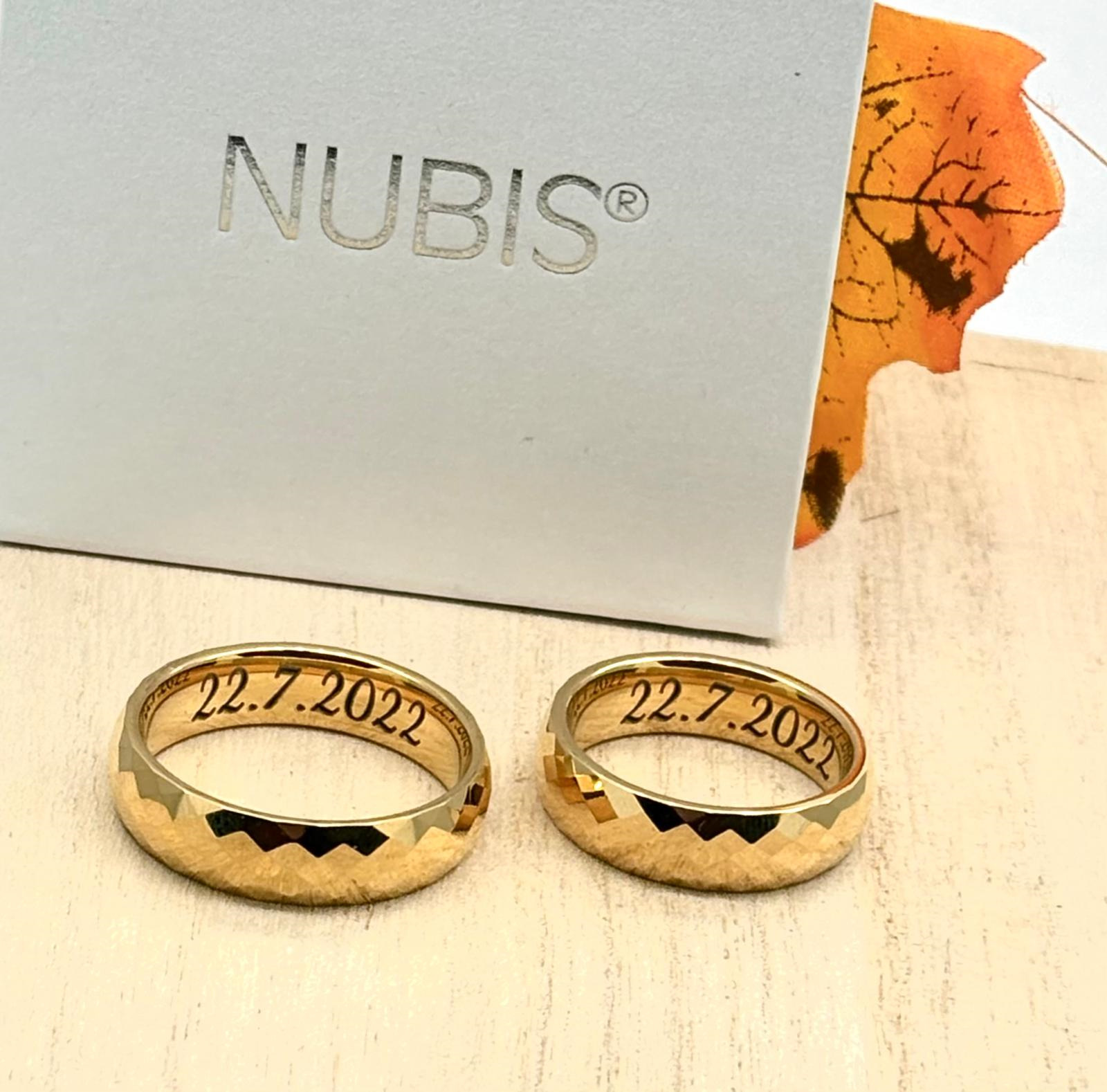 Snubní wolframový prsten se zlatou povrchovou úpravou. Prsten je zdobený leštěnými ploškami