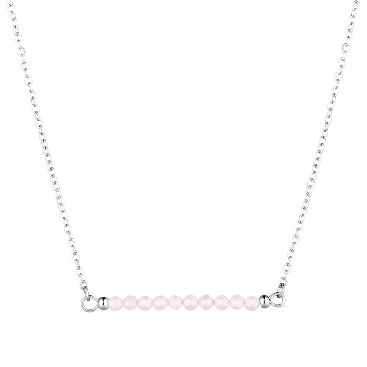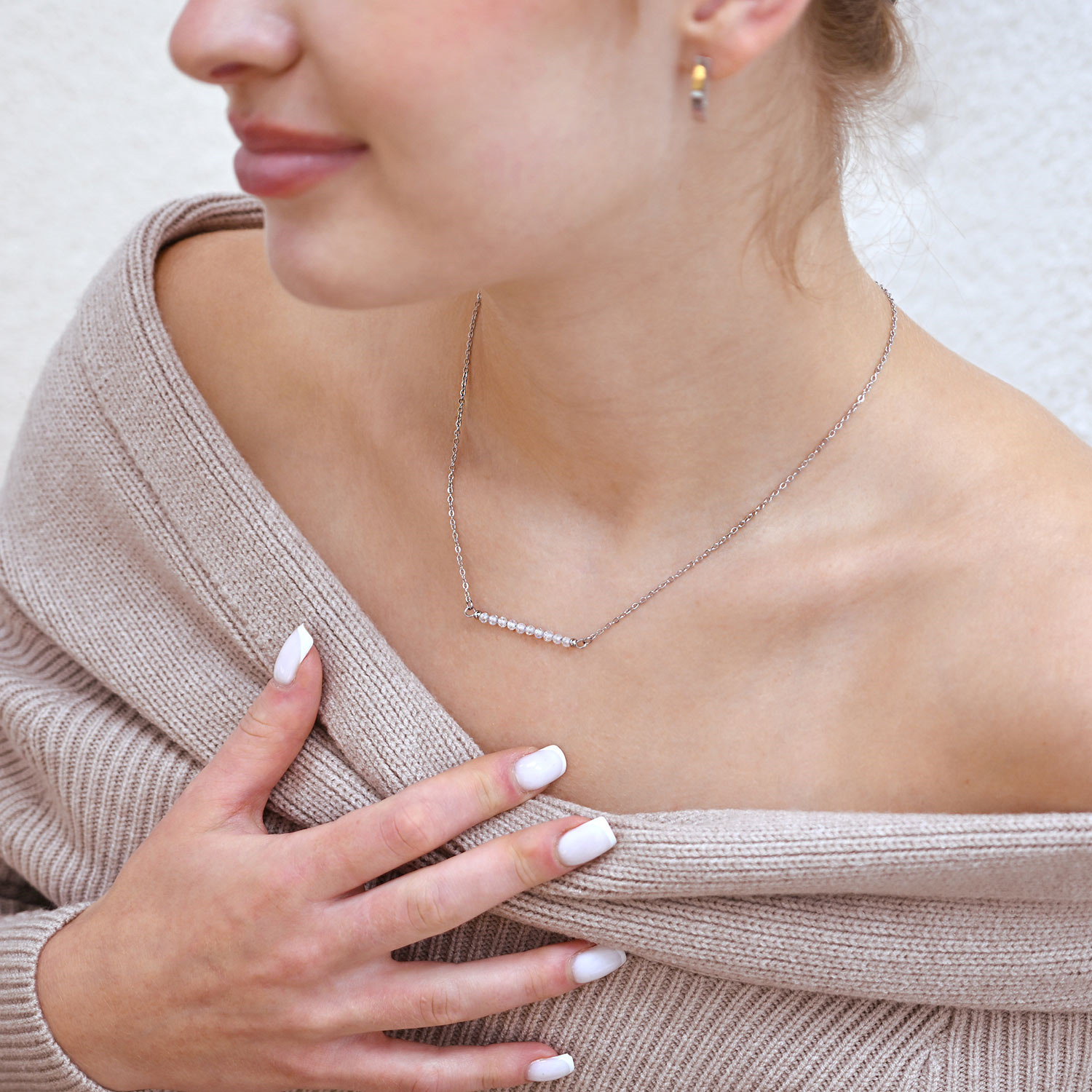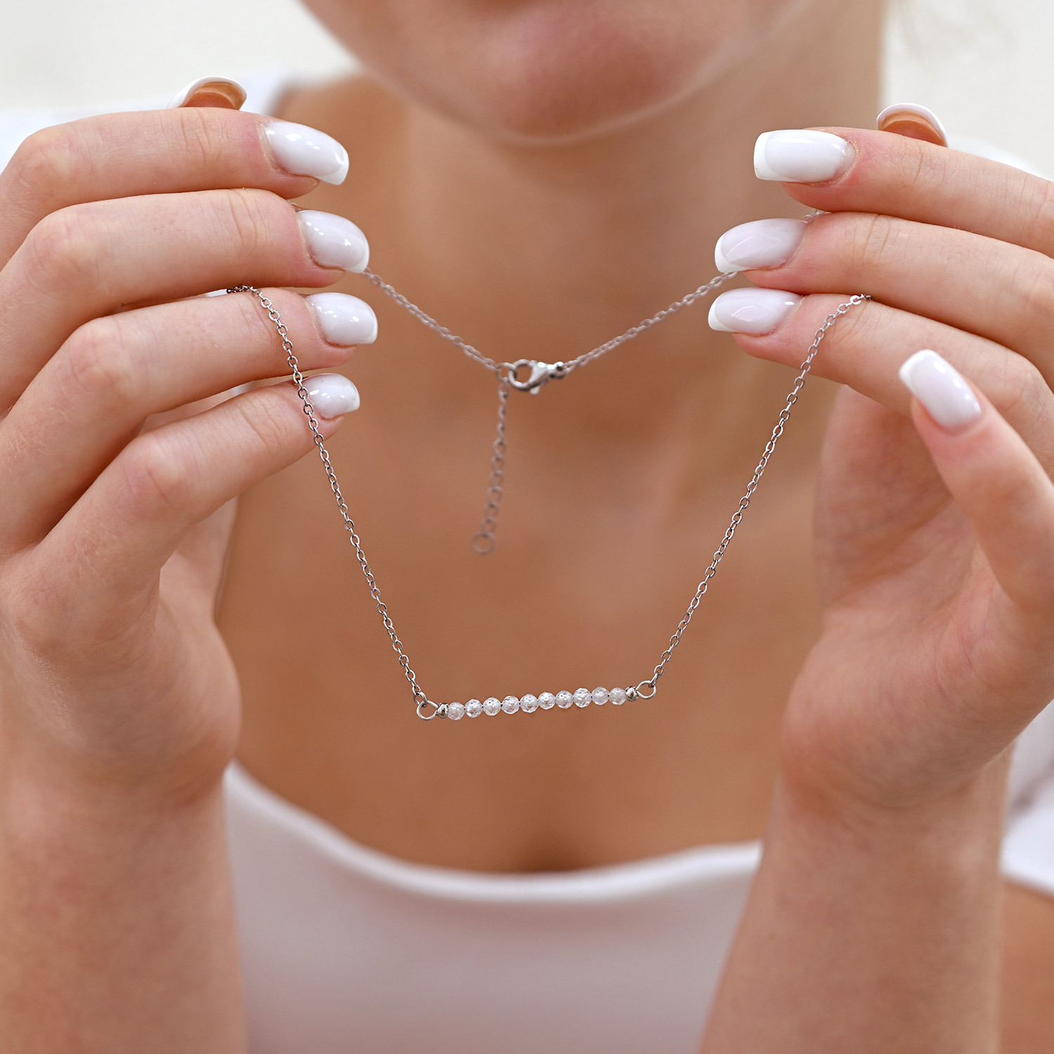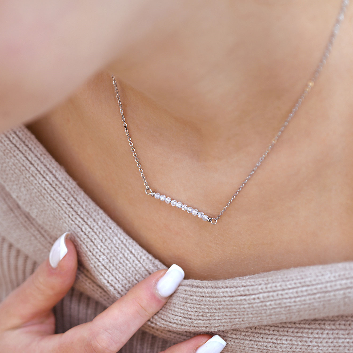 Ocelový náhrdelník je zdobený řadou zirkonových kuliček čiré barvy, které dodávají šperku jemný a elegantní vzhled.