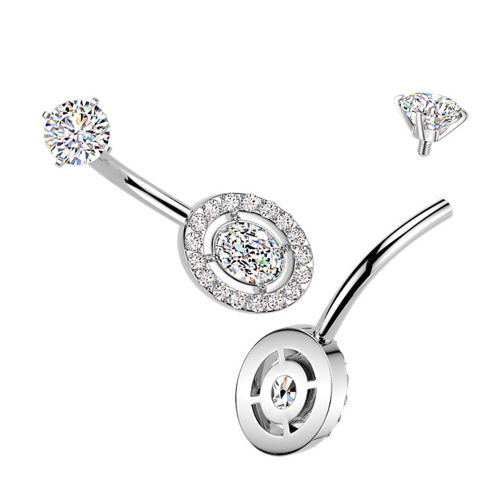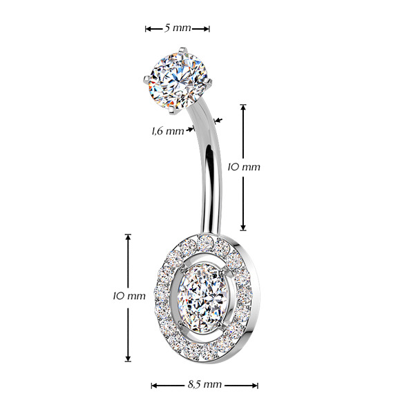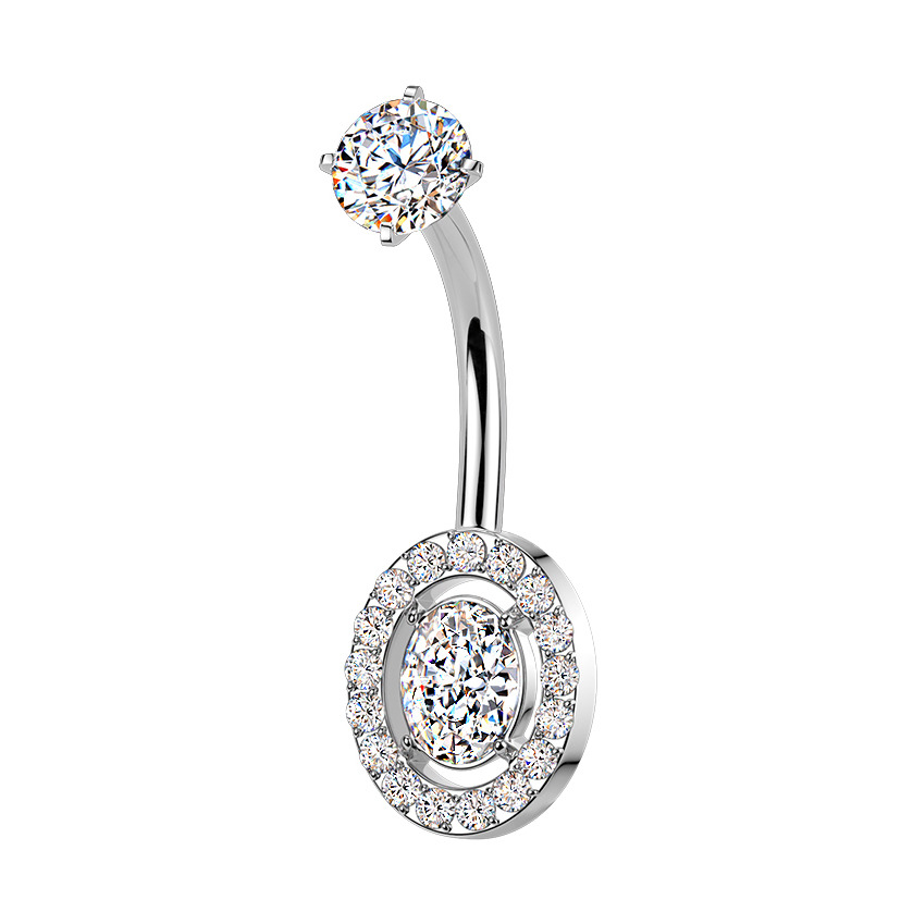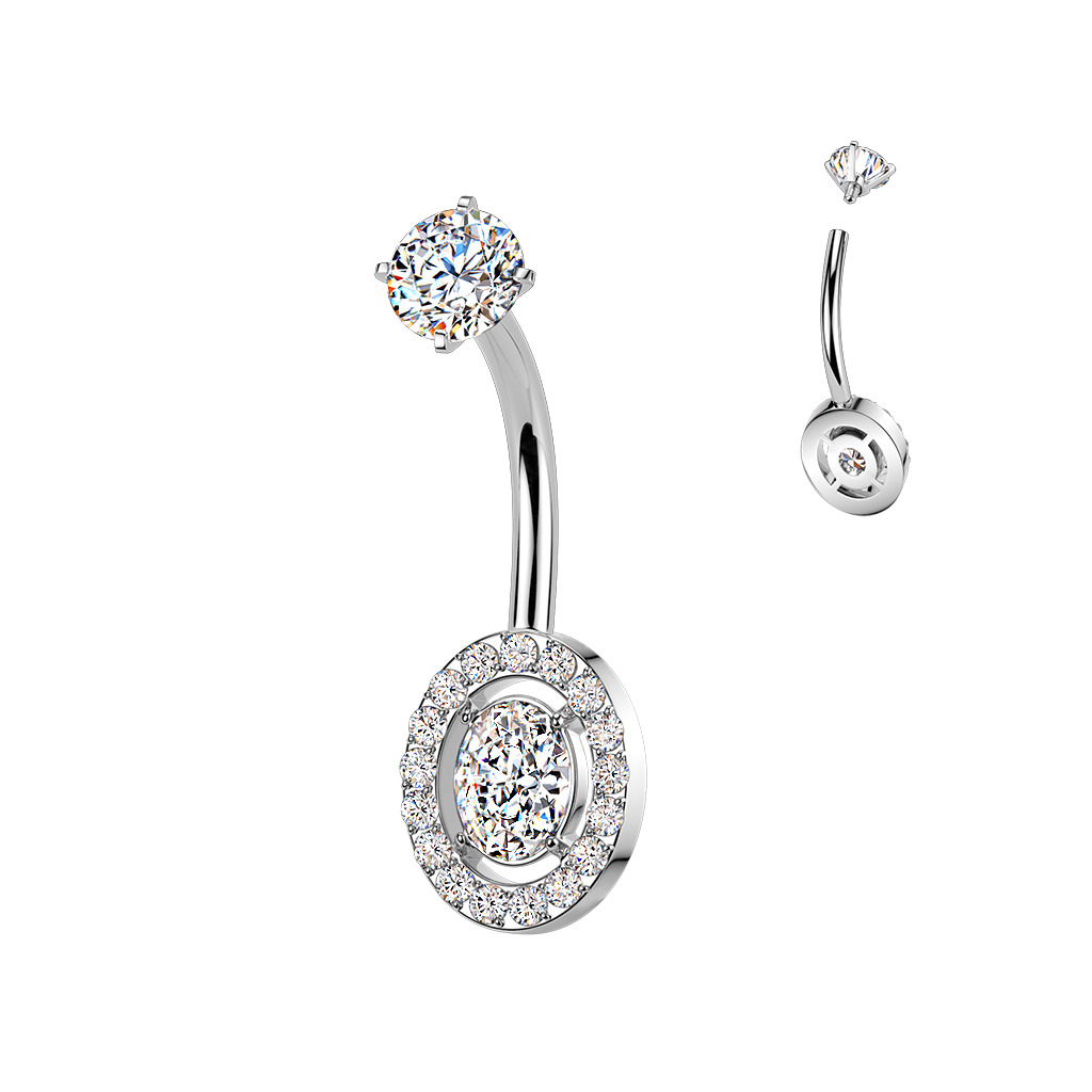 Piercing do pupíku s ozdobnou částí ve tvaru oválku dekorovaného zirkony