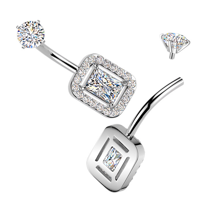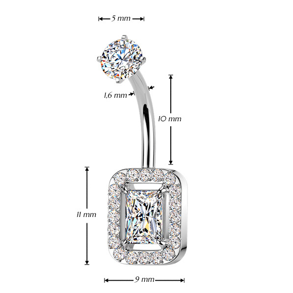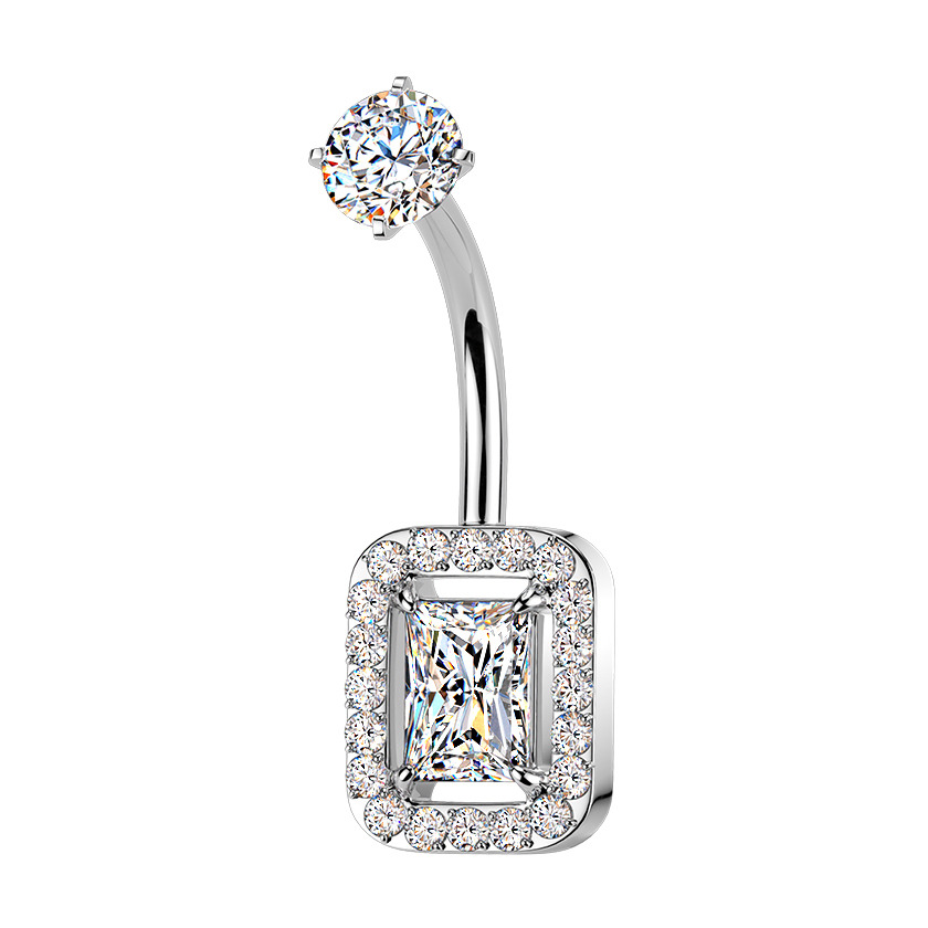 Piercing do pupíku s ozdobnou částí ve tvaru obdélníku dekorovaného zirkony