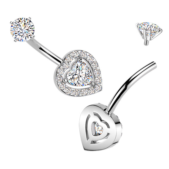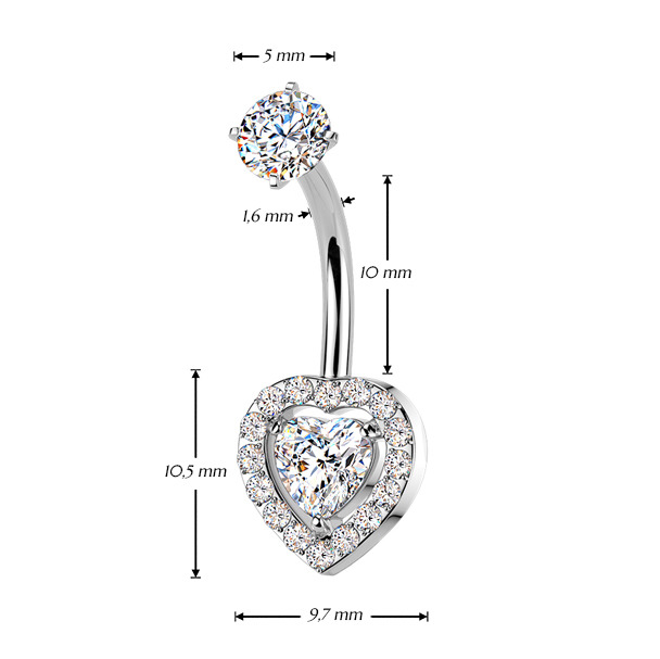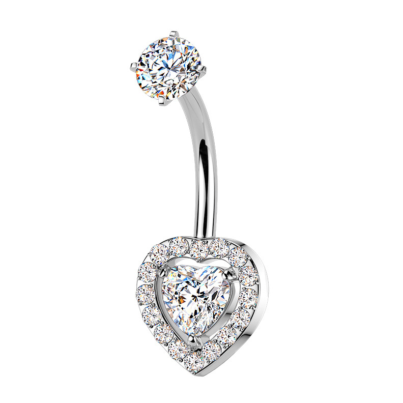 Piercing do pupíku s ozdobnou částí ve tvaru srdíčka dekorovaného zirkony