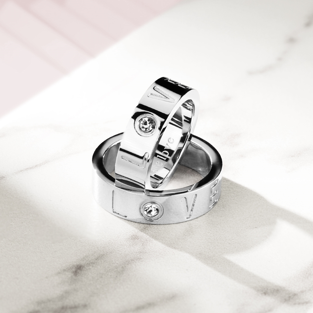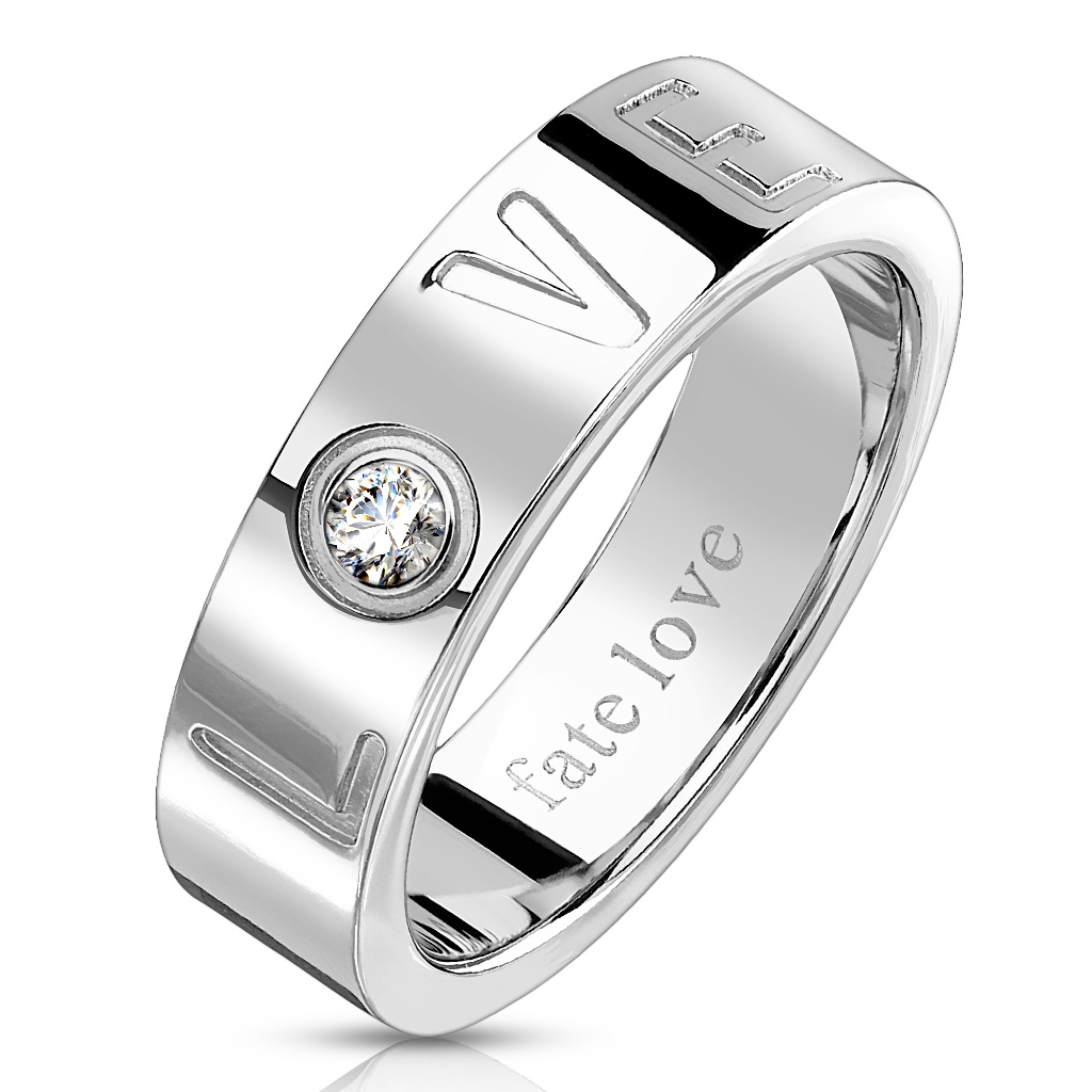 Ocelový snubní prsten zdobený kulatým zirkonem a textem "LOVE"