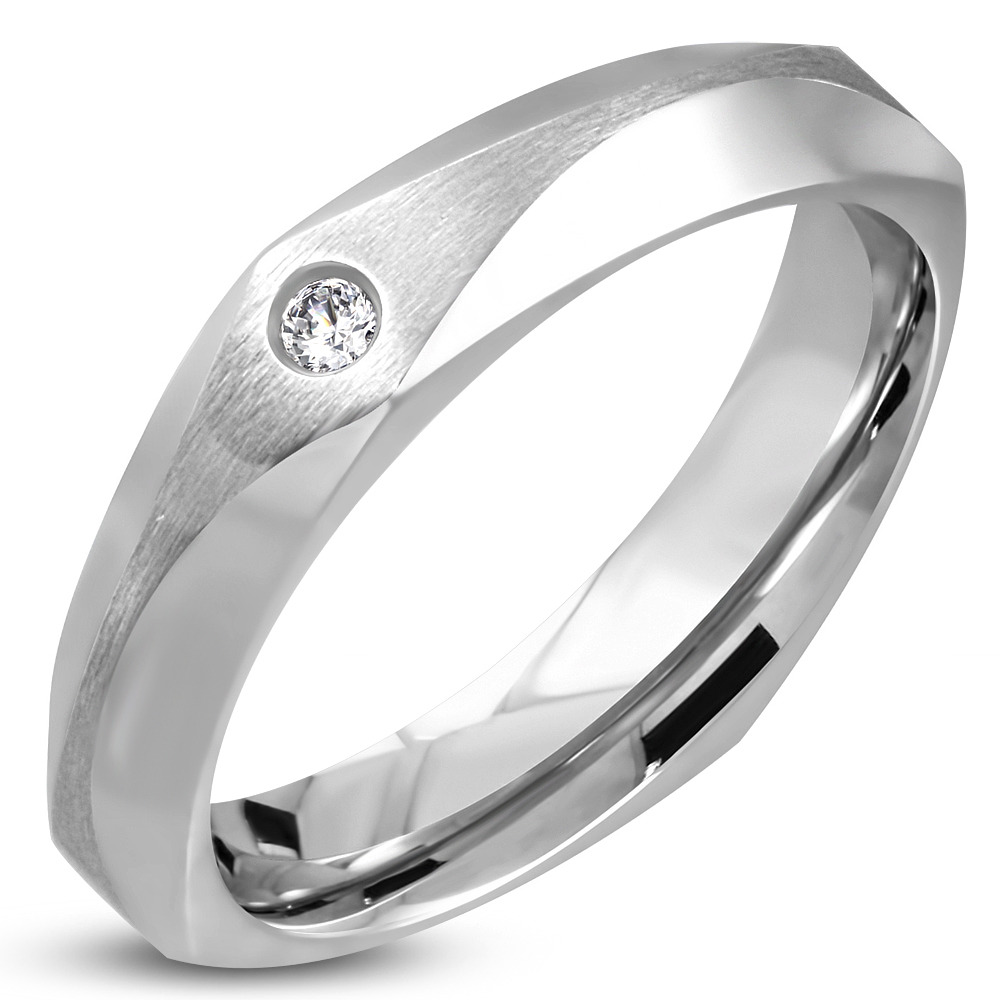 Ocelový prsten zhanatého tvaru zdobený zirkonem čiré barvy