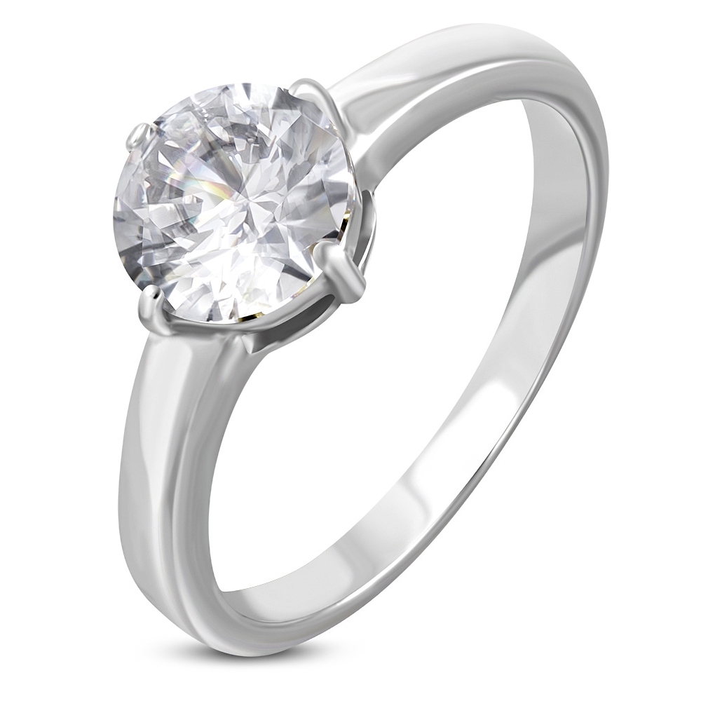 Ocelový prsten zdobený velkým kulatým zirkonem čiré barvy