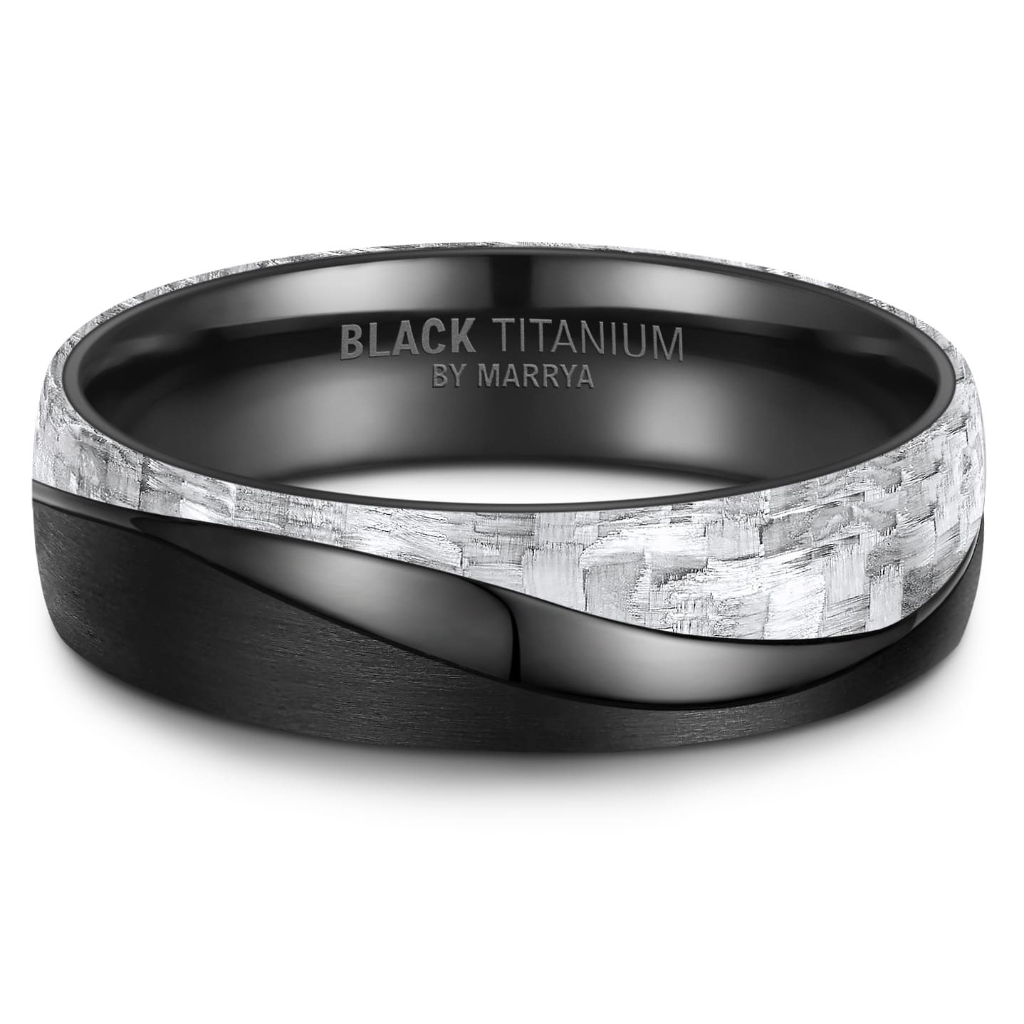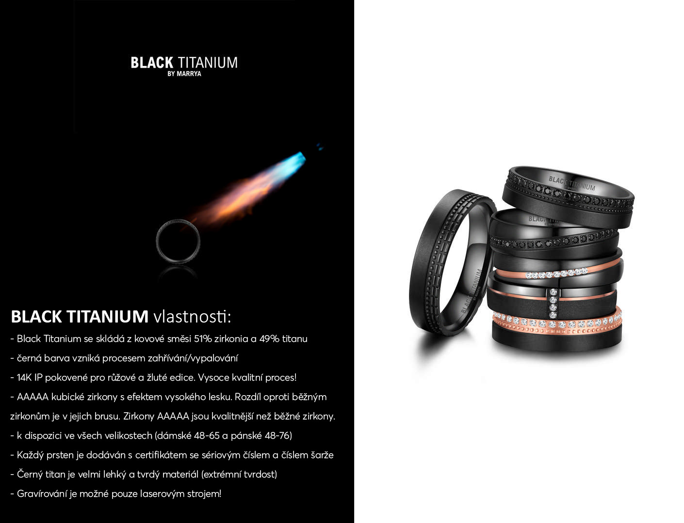 Snubní prsten z materiálu Black Titanium a karbonu černé a stříbřitě šedé barvy. Černá barva vzniká zahříváním, nikoliv nanášením povlaku, černý povrch je tak mnohonásobně kvalitnější a odolnější než povrchové úpravy nanášené PVD způsobem. BLACK TITANIUM je slitina skládající se ze směsi 51% zirkonium a 49% titanium. Směs těchto kovů je tedy velmi lehká a vysoce odolná vůči opotřebení.