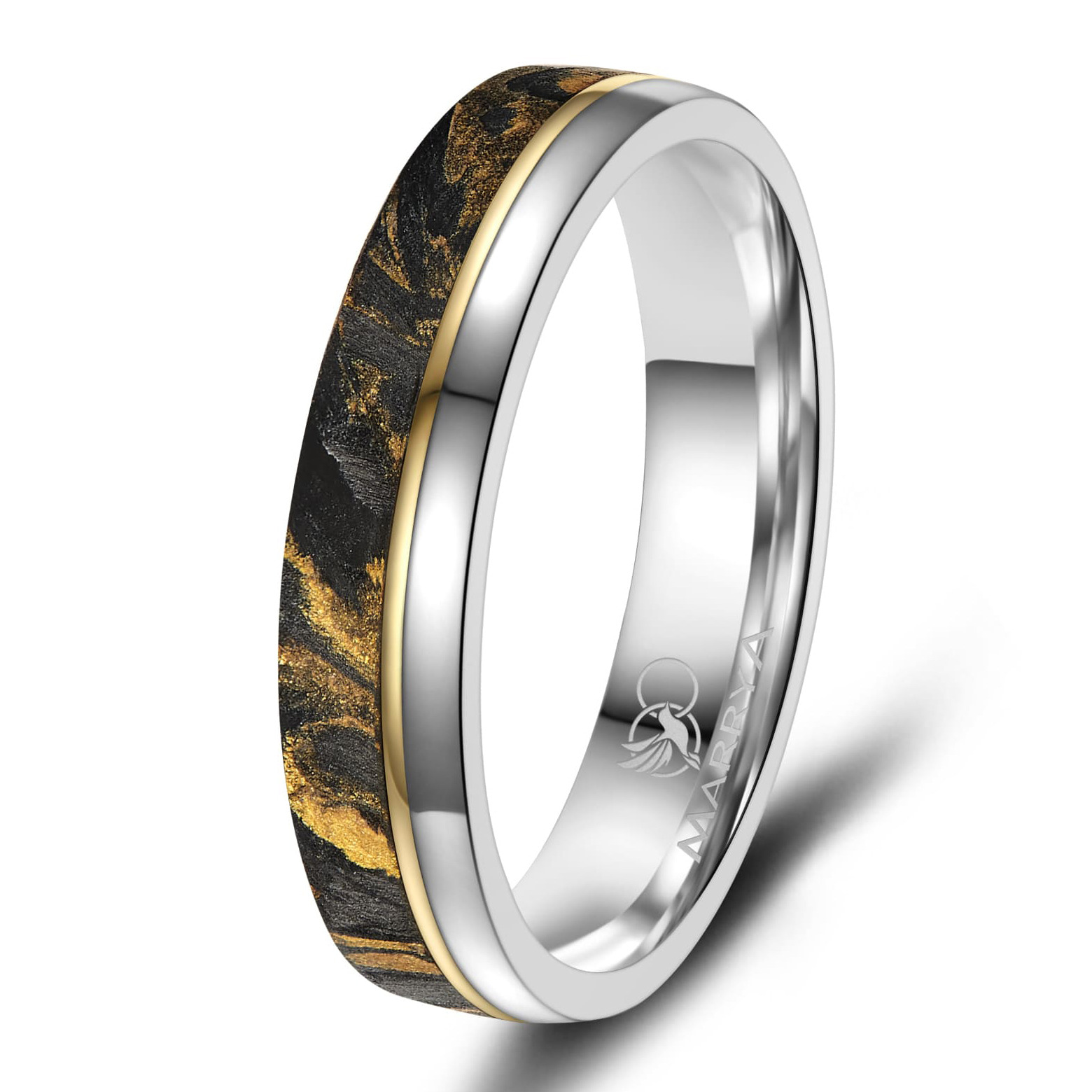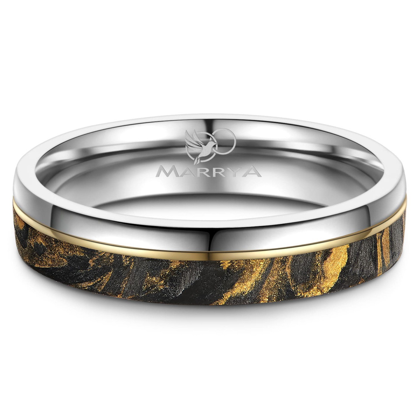 Pánský prsten je vyroben z kombinace materiálu nerezová ocel a černý karbon se zlatavými odlesky. Prsten je dekorován decentní zlacenou drážkou. Prsten má jemně zaoblený profil a je pro pohodlné nošení je uvnitř bombírovaný.