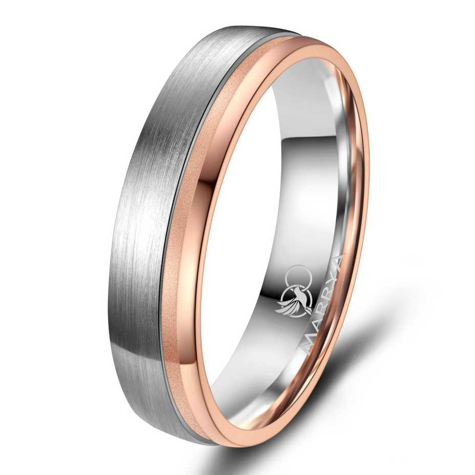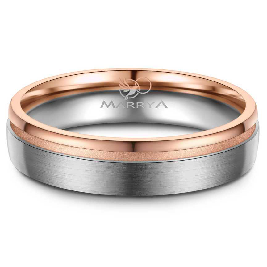 Pánský prsten má kombinovanou matnou povrchovou úpravou a povrchovou úpravu v barvě růžového zlata a po celém jeho obvodu probíhá decentní ozdobná drážka. Prsten má jemně zaoblený profil a je pro pohodlné nošení je uvnitř bombírovaný.