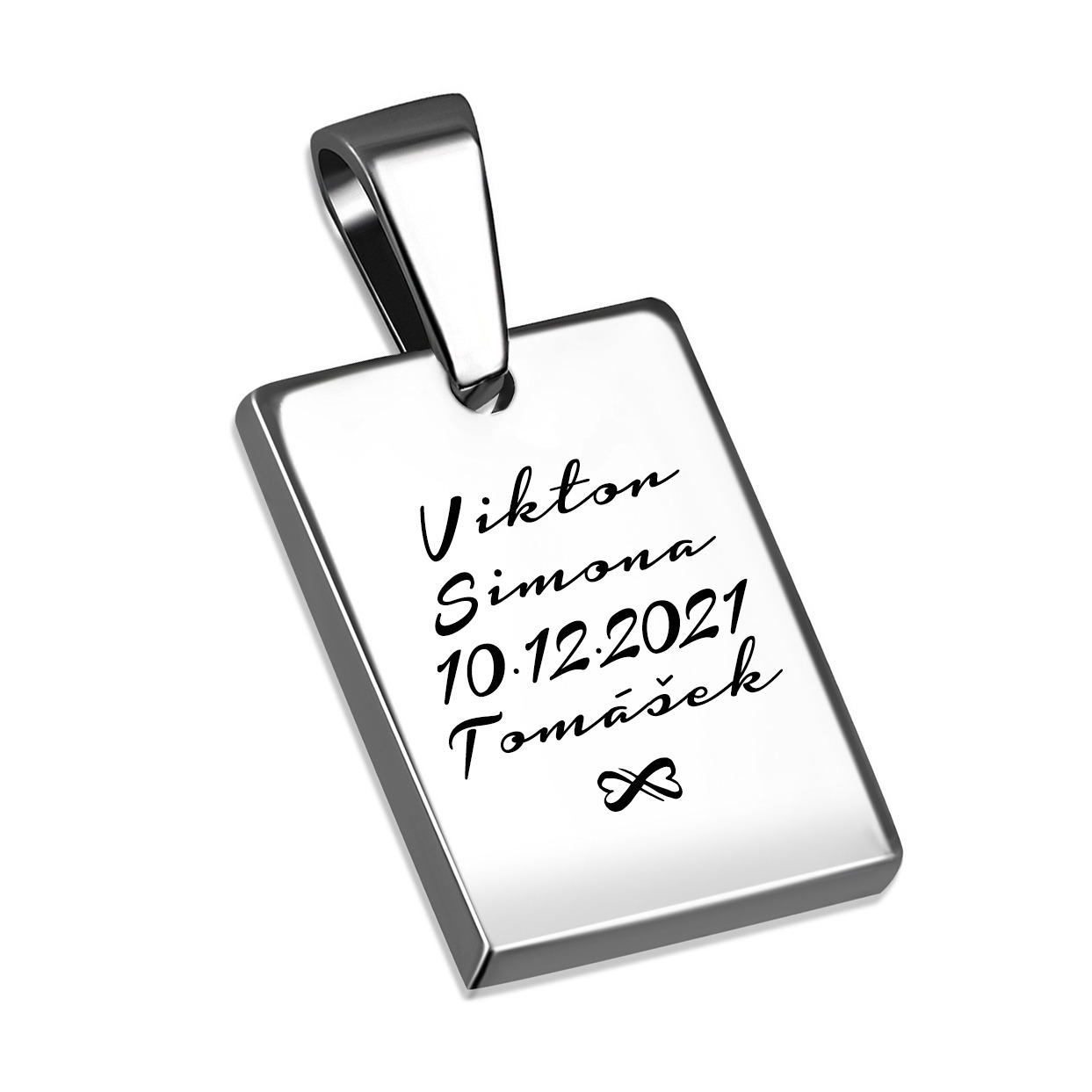 Drobný obdélníkový přívěsek s s rytinu vašeho vlastního textu. Šperk je vyrobený z jakostní nerezové oceli 316L a má leštěný povrch. Přívěsek může být skvělým osobním dárkem pro Vaši manželku, partnerku, maminku, nebo kamarádku k narozeninám, Vánocům nebo jako připomínka mimořádné události či osobním vzkazem milované osobě!