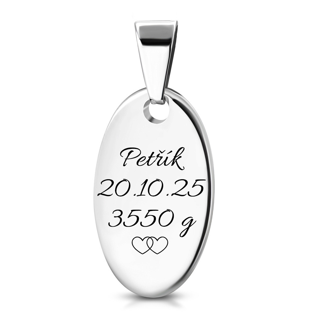 Drobný oválný přívěsek s s rytinu vašehovlastního textu. Šperk je vyrobený z jakostní nerezové oceli 316L a má leštěný povrch. Přívěsek může být skvělým osobním dárkem pro Vaši manželku, partnerku, maminku, nebo kamarádku k narozeninám, Vánocům nebo jako připomínka mimořádné události či osobním vzkazem milované osobě!
