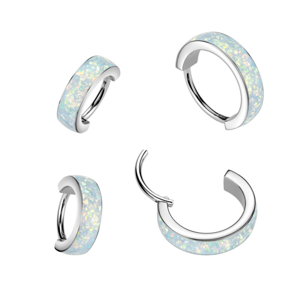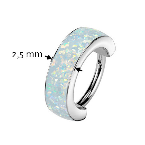 Ozdobný piercing - segment kruh se skrytým zapínáním a výplní ze syntetického bílého opálu