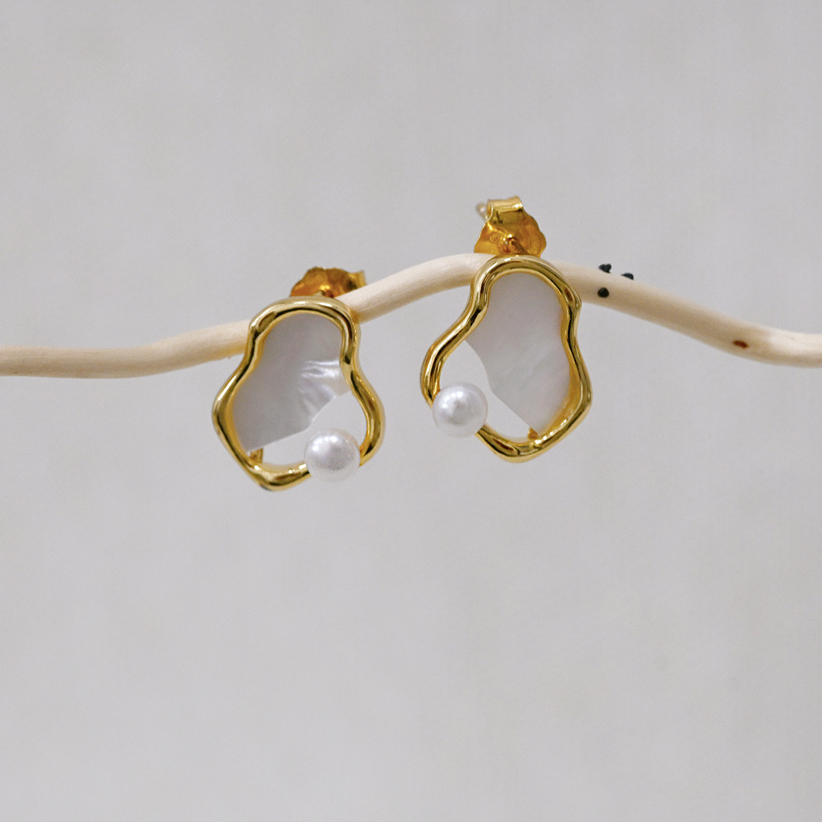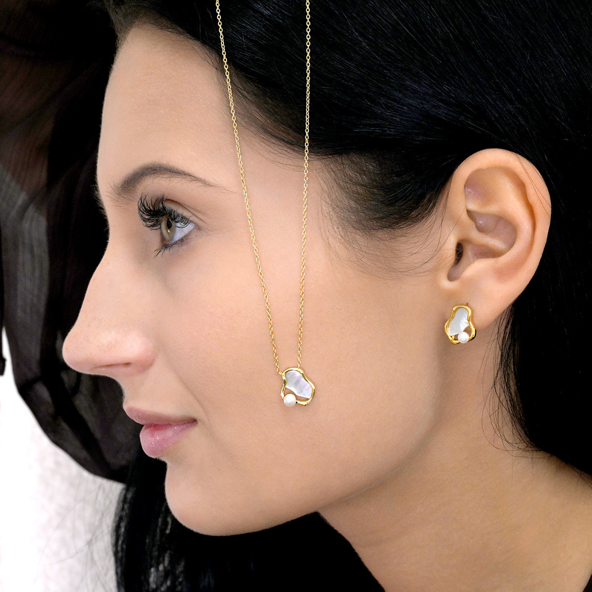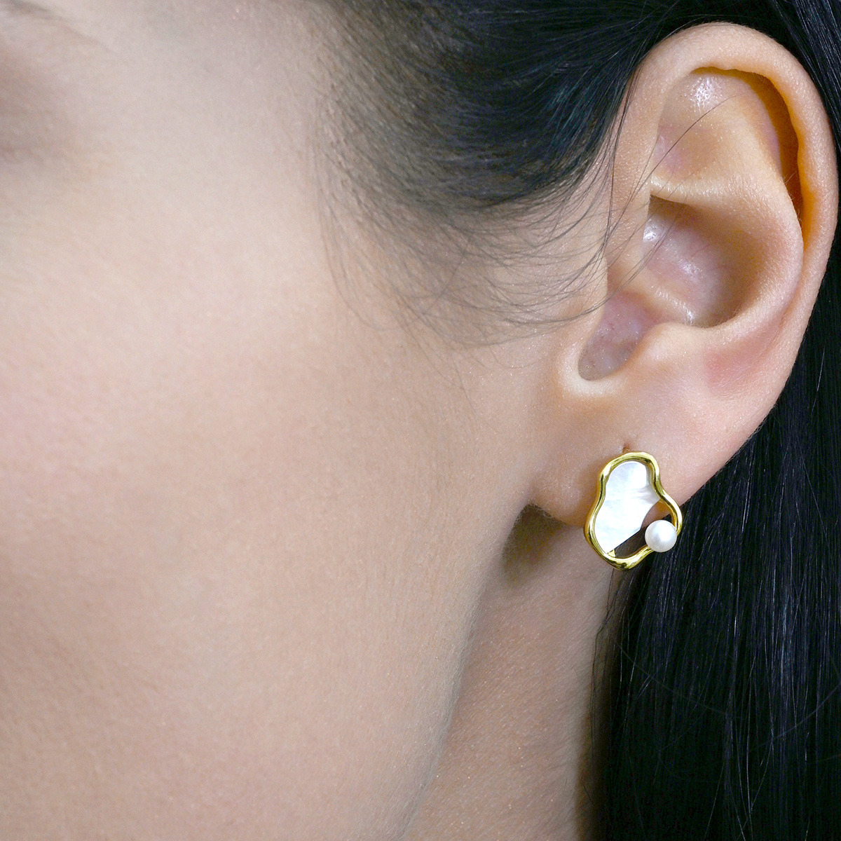 Náušnice s nepravidelným tvarem a pravou říční perlou přinášejí eleganci a originalitu. Každý kus je jedinečný díky přírodnímu materiálu.