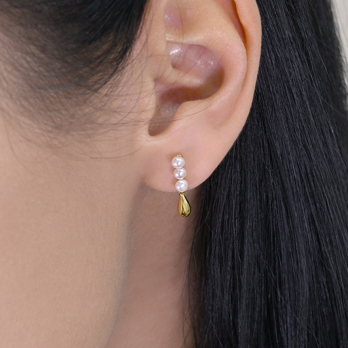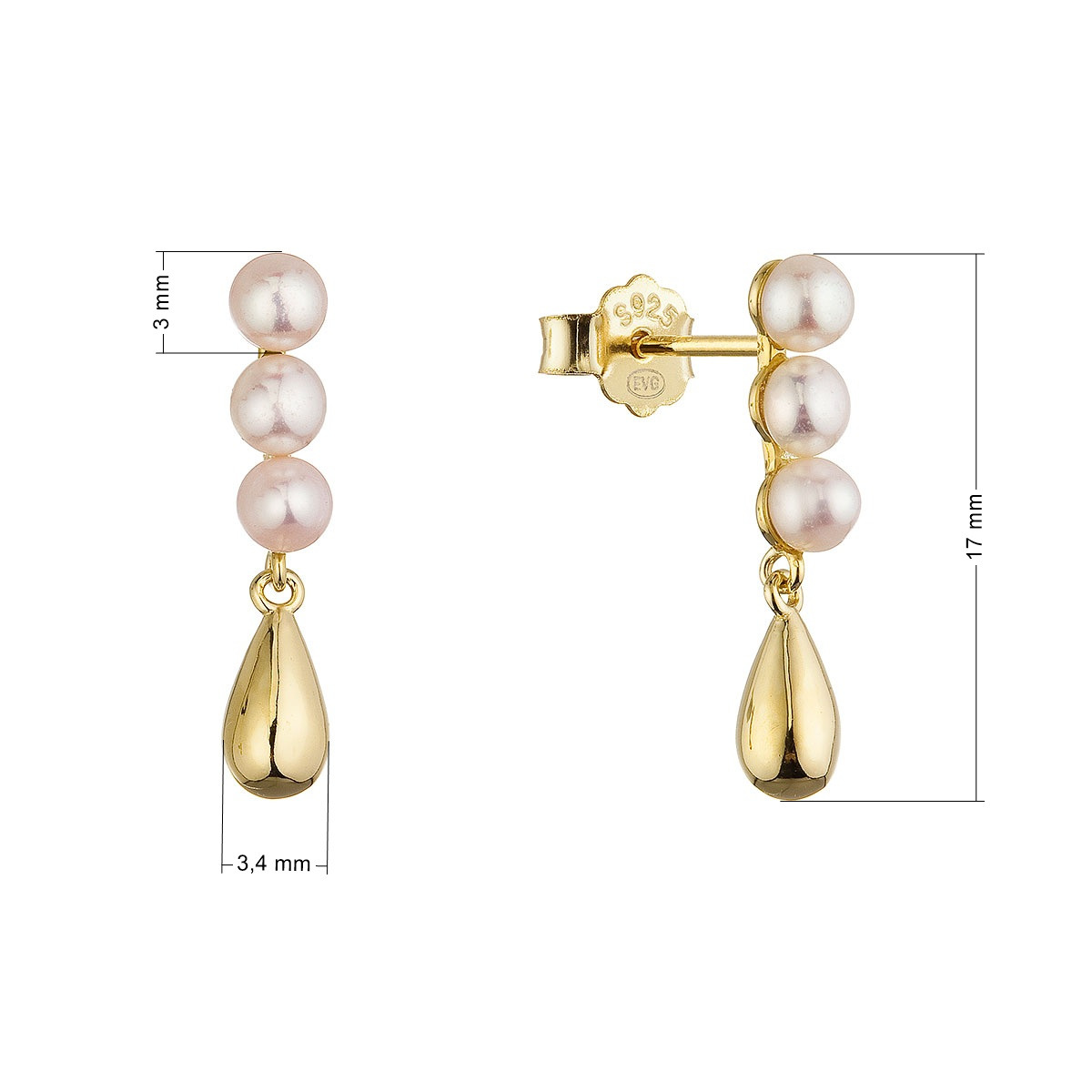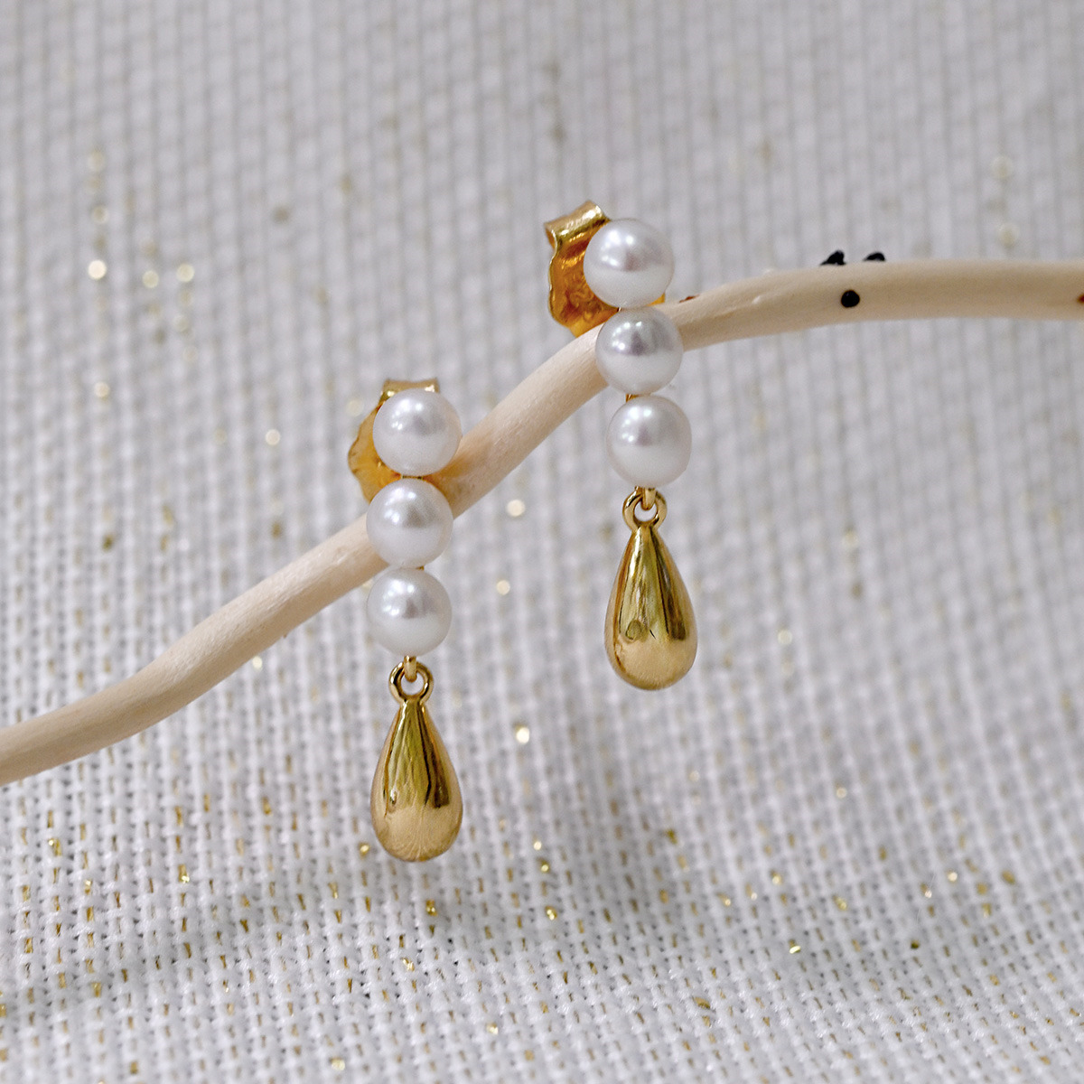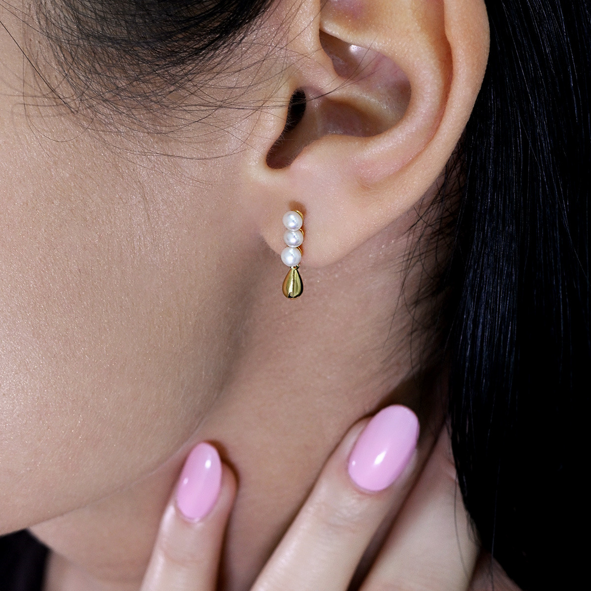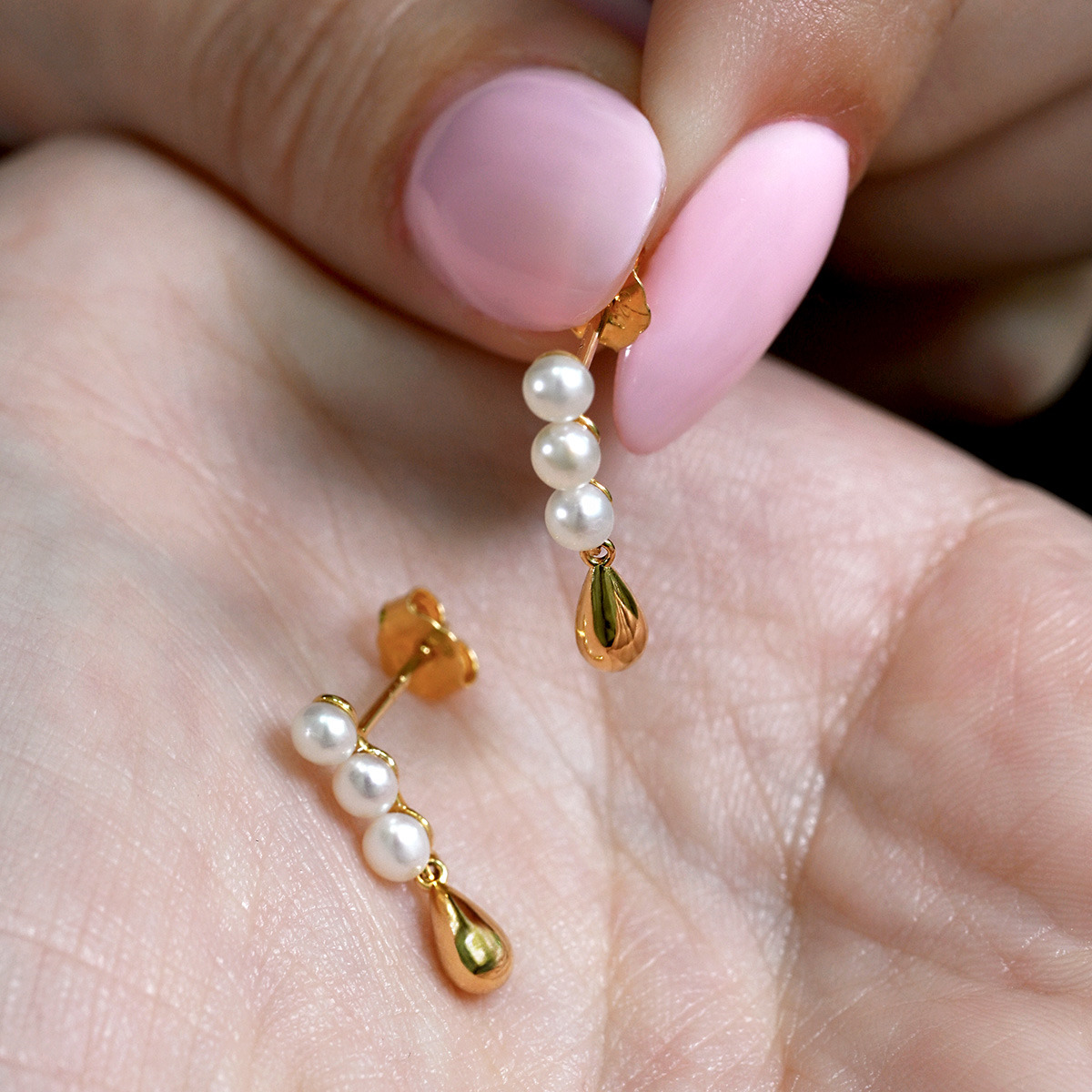 Perly jsou uspořádány ve tvaru tří kulatých perel, pod nimiž je zavěšena zlatá kapička, což dodává náušnicím jedinečný vzhled.