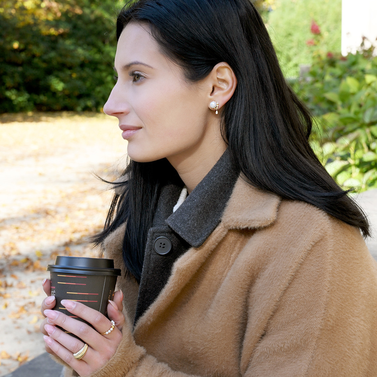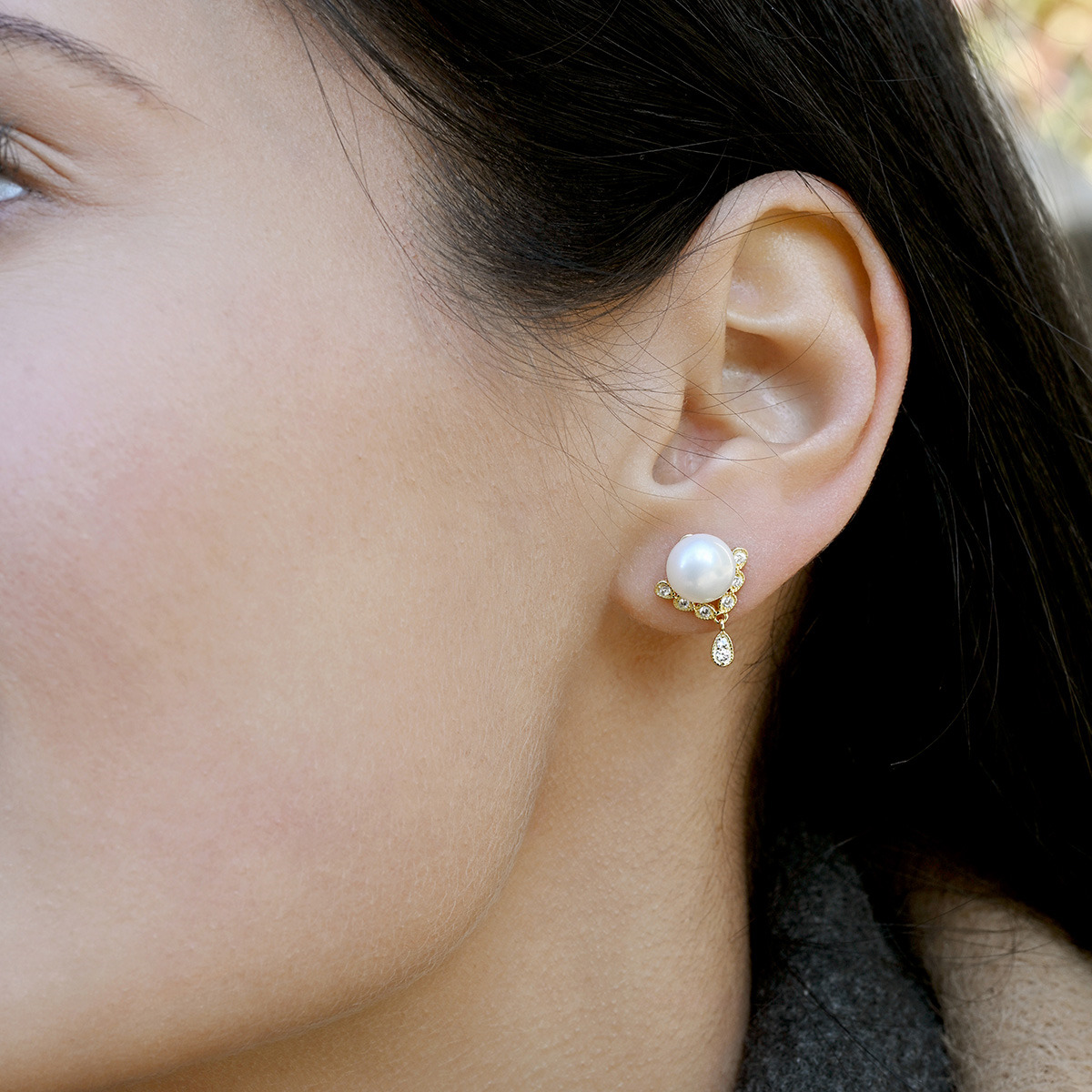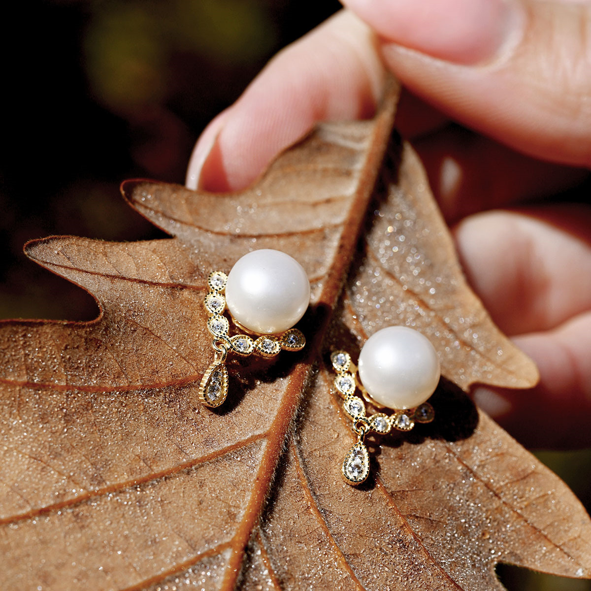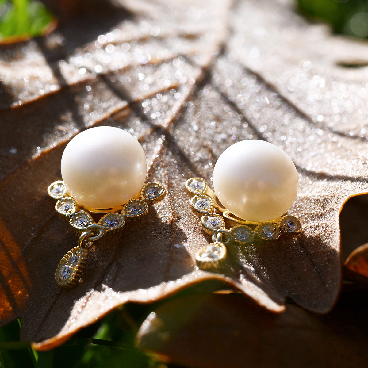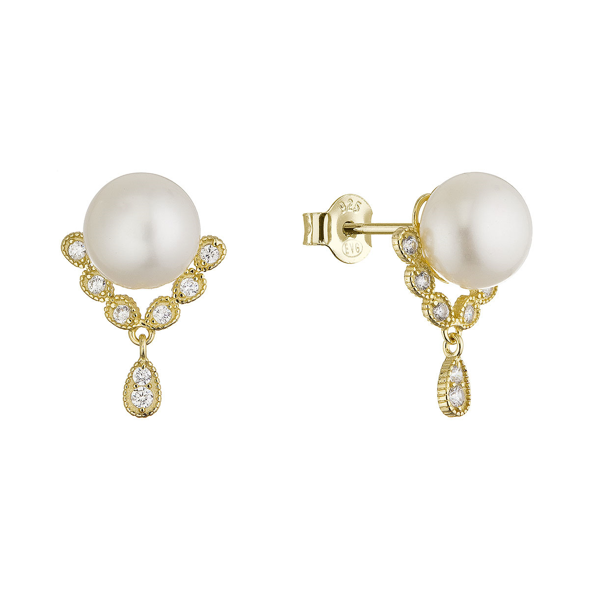 Pod perlou se nachází pozlacený trojúhelníček se zavěšenou kapičkou, zdobený zirkony, což dodává náušnicím jedinečný vzhled.