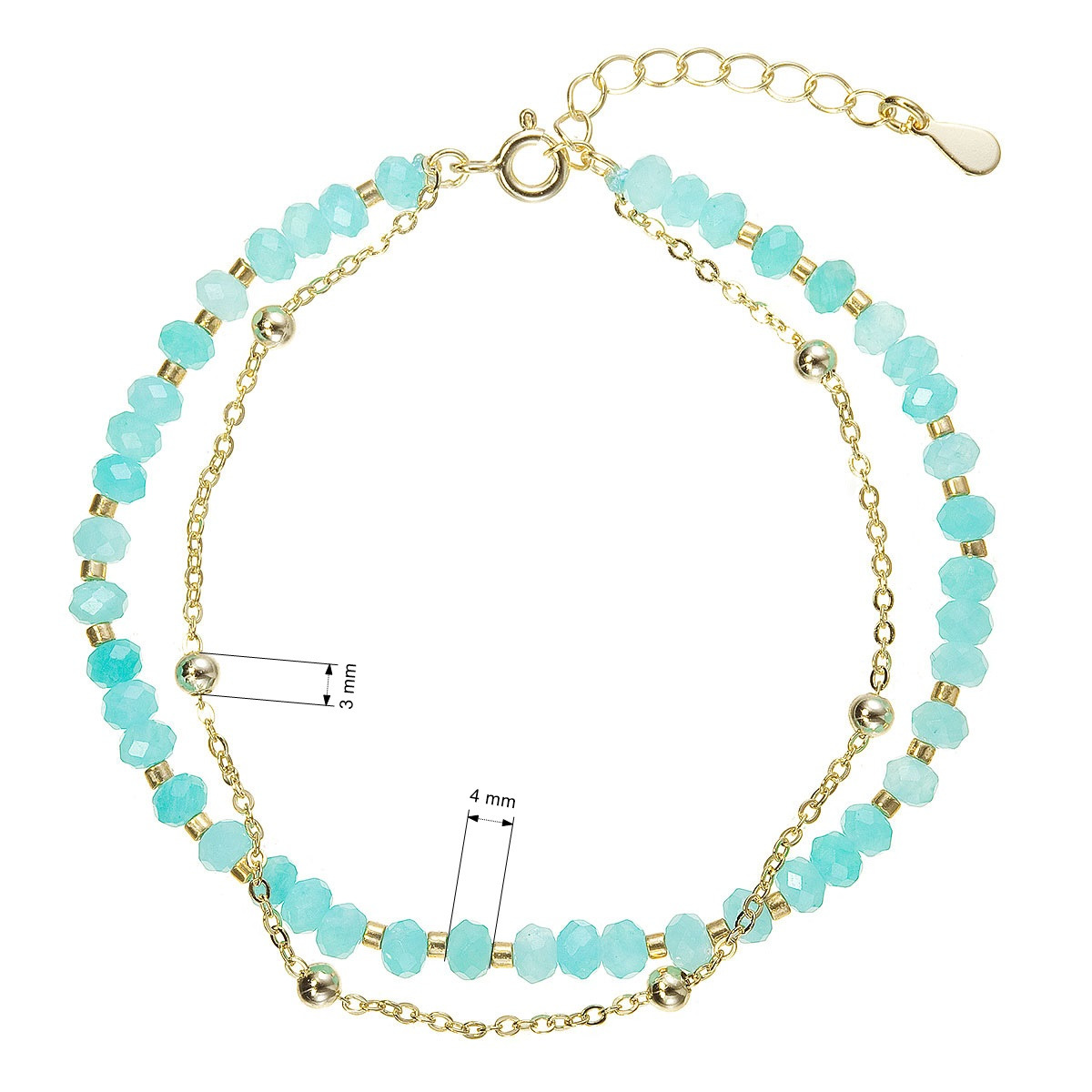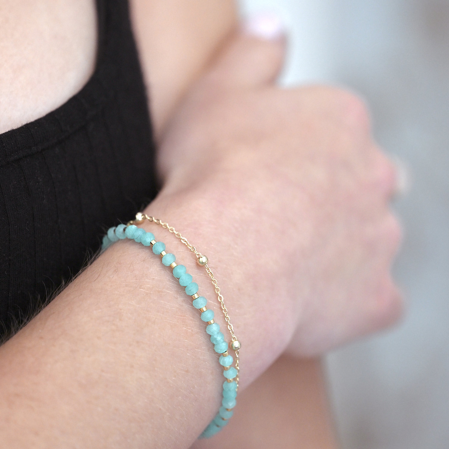 Tento rafinovaný dvojitý náramek kombinuje zlatavý řetízek z pozlaceného stříbra s korálky z pravých amazonitů v jemně tyrkysové barvě. Kontrast teplého zlata a chladivých tónů minerálu vytváří moderní, harmonický a velmi svěží design.