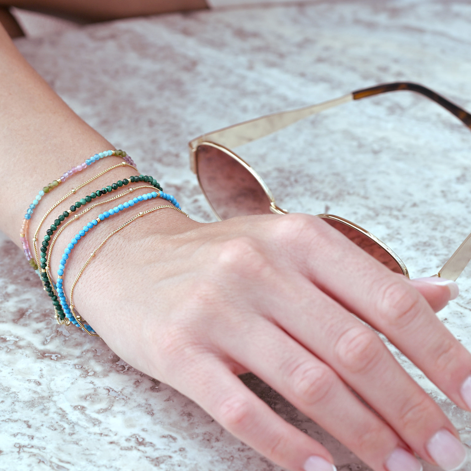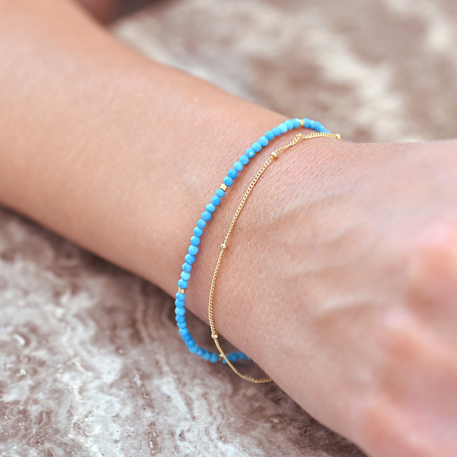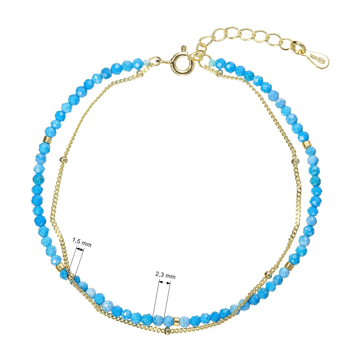 Tento jemný dvojitý náramek spojuje tenký řetízek z pozlaceného stříbra a linii drobných broušených korálků z pravého howlitu barveného do zářivě modré barvy. Pozlacené stříbro ryzosti 925/1000 dodává šperku teplý zlatavý tón a elegantní vzhled. Náramek je vybaven zapínáním na karabinku a praktickou adjustou, díky níž lze jeho délku pohodlně upravit z 17 cm až o další 4 cm. Stylový, lehký a moderní doplněk, který dokonale rozzáří každý outfit.