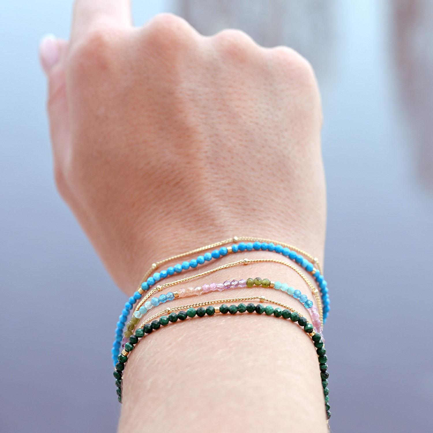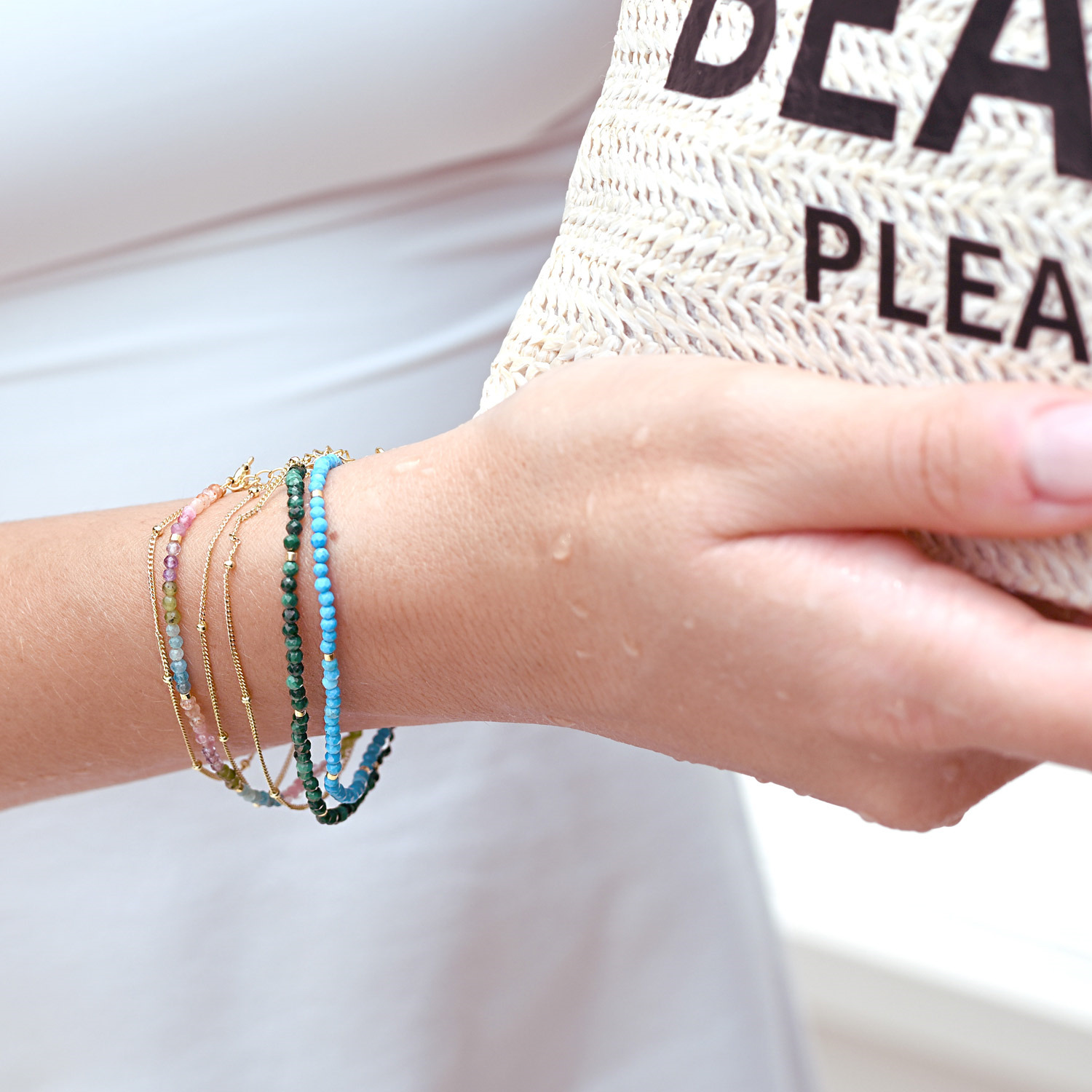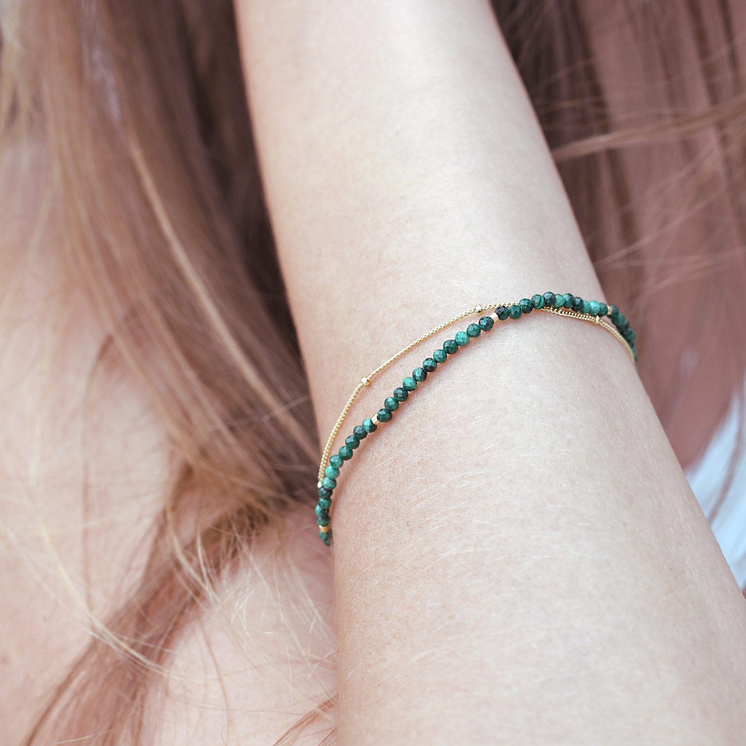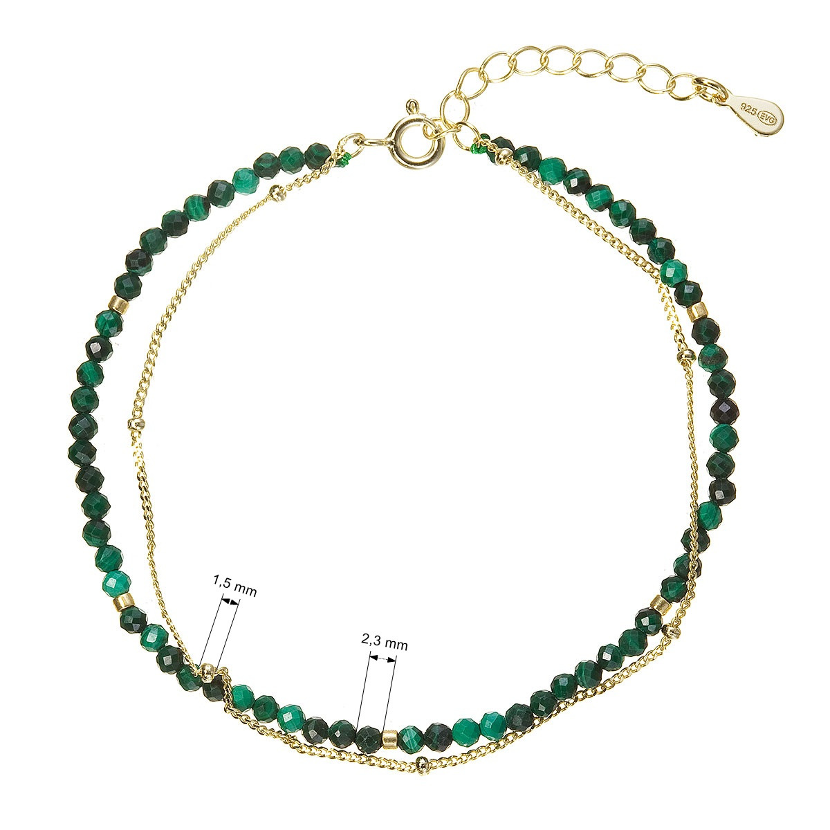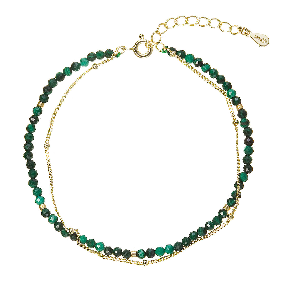 Tento stylový dvojitý náramek spojuje zlatavý řetízek z pozlaceného stříbra a linii drobných korálků z pravého malachitu v bohaté zelené barvě. Teplý odstín zlata se dokonale doplňuje s hlubokými tóny malachitu, díky čemuž šperk působí elegantně a harmonicky. Vyroben ze stříbra ryzosti 925/1000 pokrytého vrstvou zlata. Zapínání na karabinku a prodlužovací řetízek umožňují upravit délku z 17 cm o další 4 cm. Náramek, který dodá každému outfitu kapku luxusu a přírodní energie.