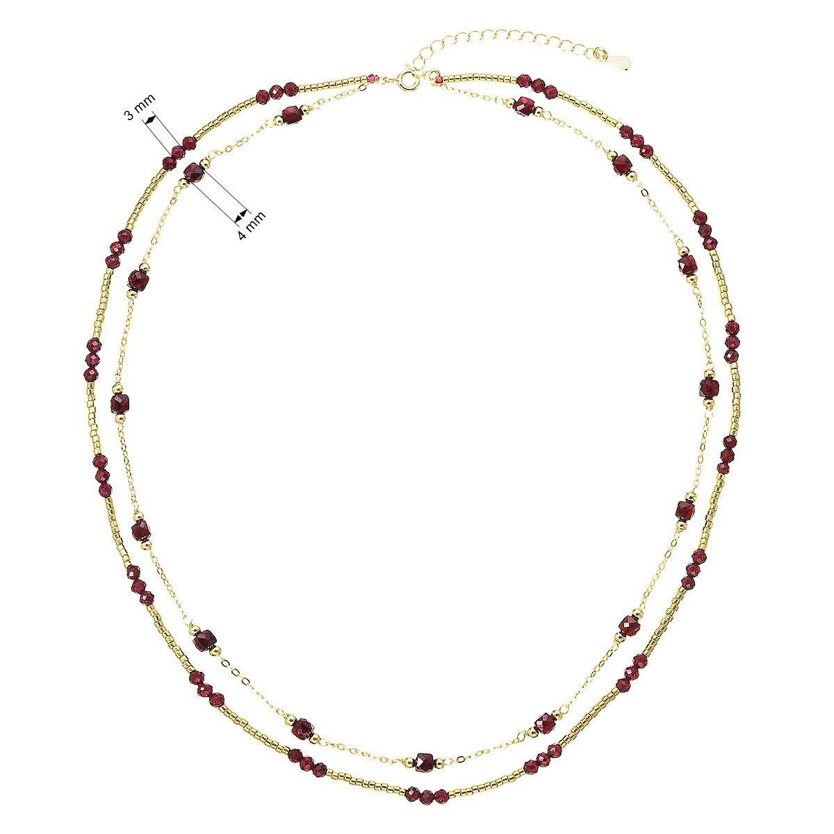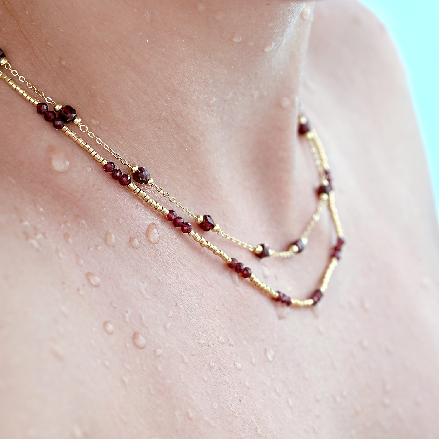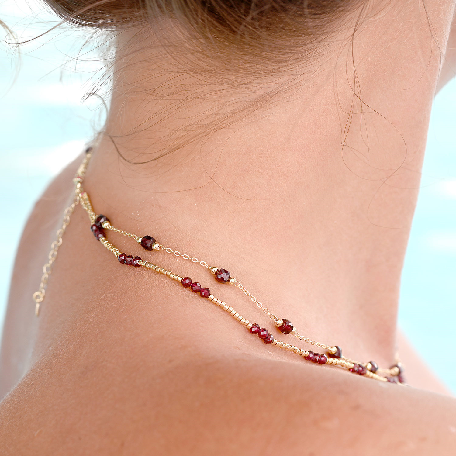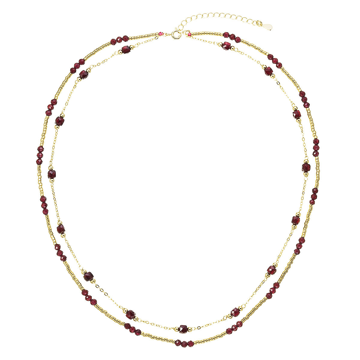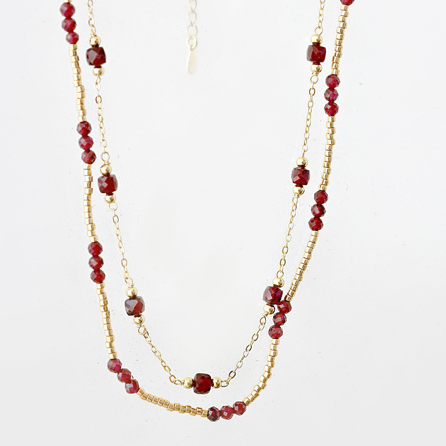 Okouzlující jemný dvouřadý náhrdelník s drobnými přírodními kamínky granáty působí lehce a elegantně.